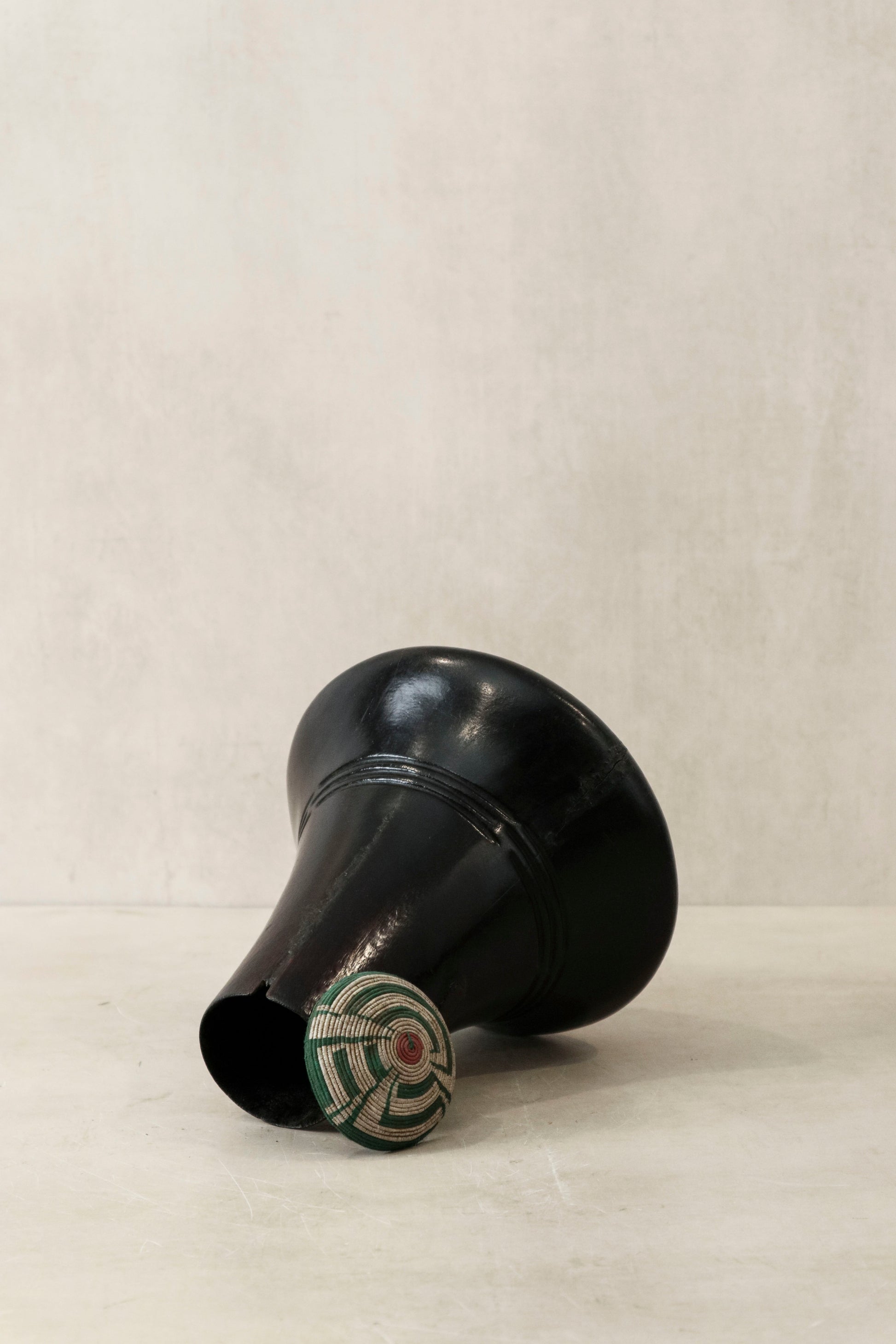 A really fine specimen from Uganda. This milk jug were used for keeping milk upon milking the cow. Often, as is the case of this jug, it was a measure of the amount of milk that a bride-to-be had to drink daily to fatten her up as the Bahima people demonstrated their wealth by the fatness of their daughters. The jug is made of the omusisa tree; carefully carving out the inside to hollow the core. After completing this process it would be soaked in the mud found in a shallow well for one week and then it was put in the soot or smoke of a lamp to blacken it to the desired color. Most of these jugs would split over time requiring a metal bandage of sorts so that it would not leak.