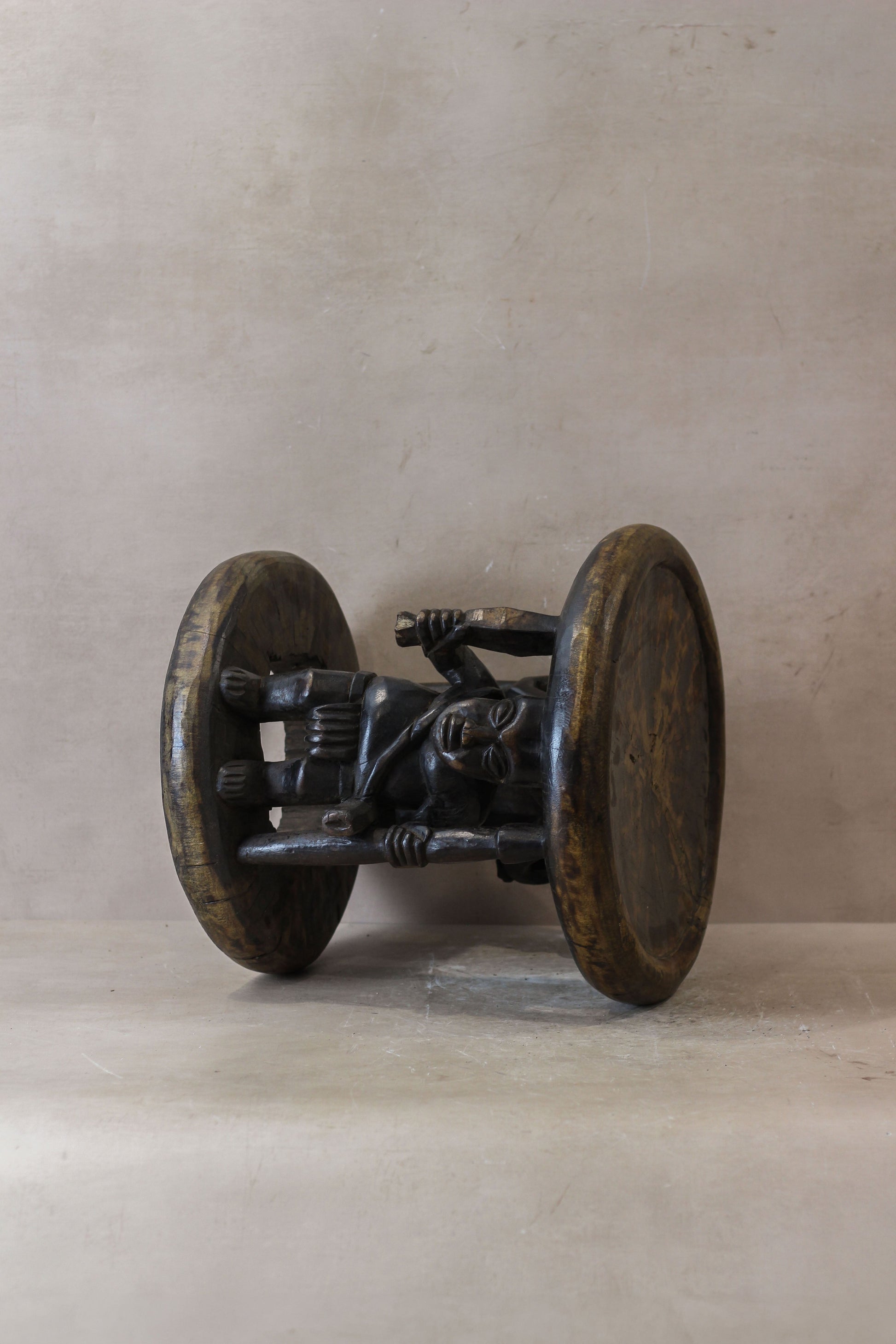 This Baule wood carved vintage stool is a stunning piece of traditional African craftsmanship. Hand-carved from solid wood by the Baule people, it features intricate patterns and smooth contours, reflecting the cultural artistry of its origins. The stool's rich, natural patina has developed over time, enhancing its vintage appeal. Its sturdy yet elegant design makes it a versatile accent, perfect for adding a touch of history and character to any space. Whether used as seating, a side table, or a decorative object, this stool is a unique and timeless addition to any collection.