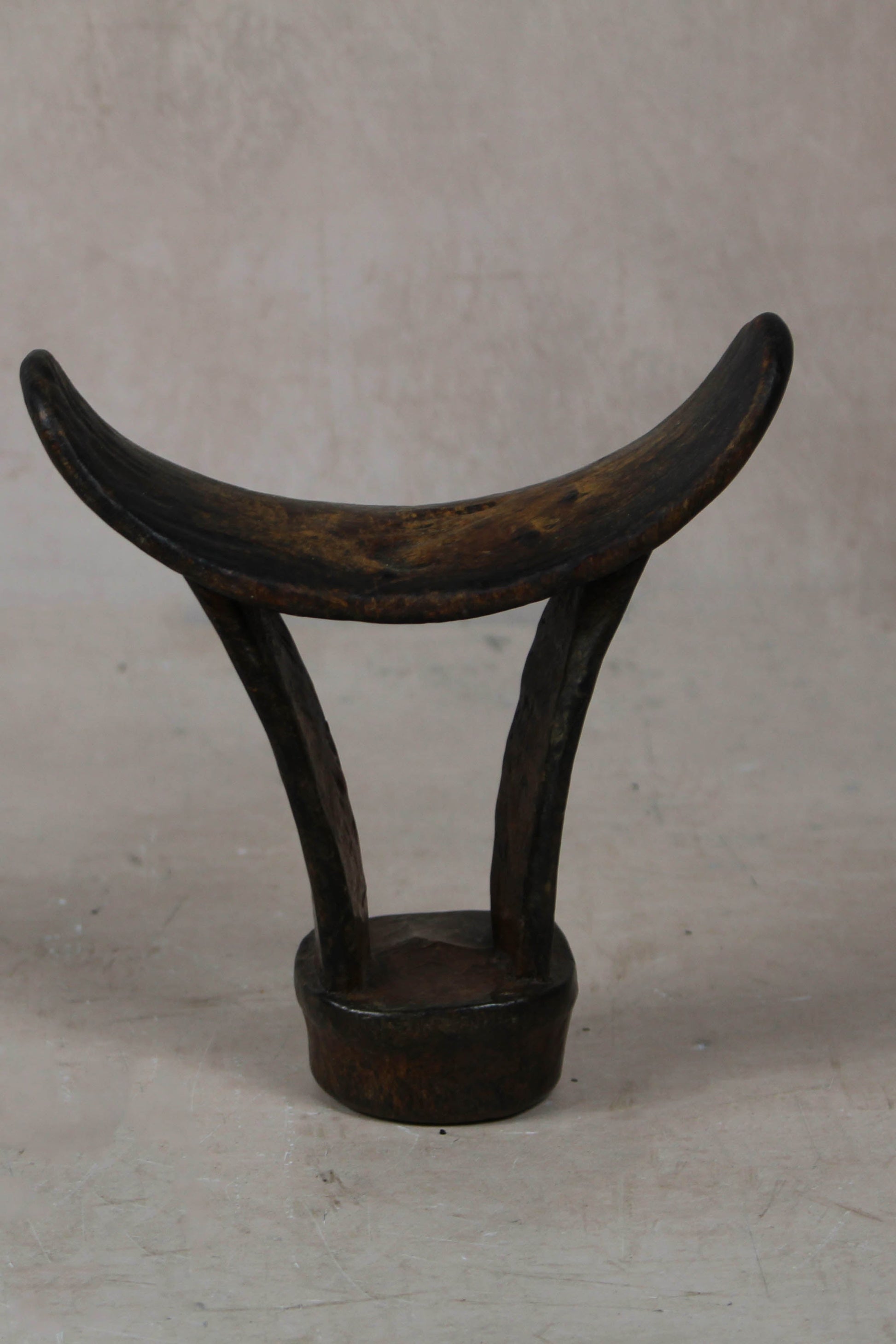 These solid wood Headrests are from groups in southern Ethiopia used to enable people to sleep without interfering with their complicated coiffure (hairstyles). Hairstyles frequently declare their owner's age, gender and status, and are often embellished by accoutrements of a magic-religious nature. Hairstyles therefore need protecting. The headrest also plays a role in nuptial ceremonies.