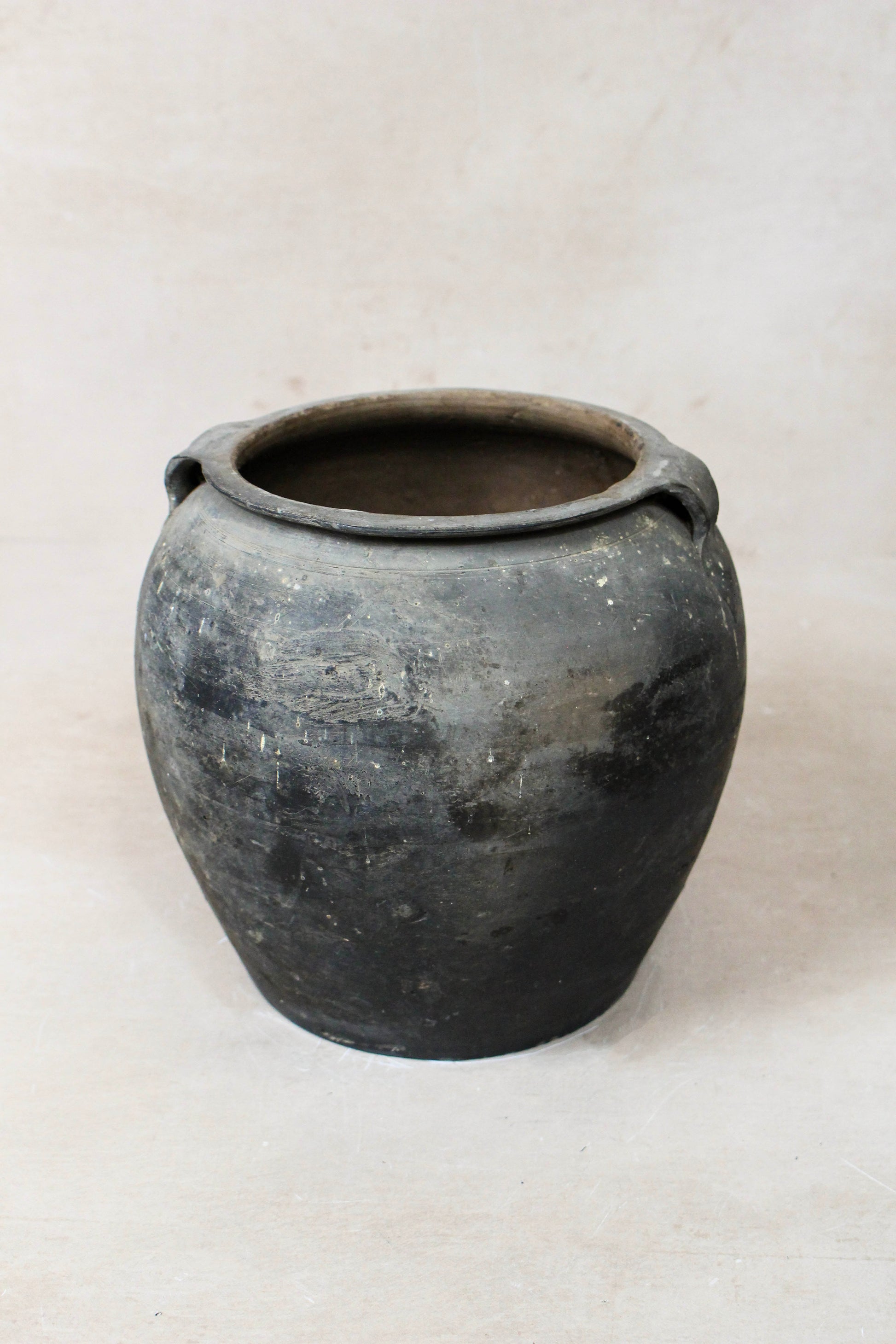 Vintage grey earthenware pot with signs of aging. These pots are hand made and are very decorative. They have a beautiful patina due to age. They are from the Shanxi province and crafted c. 1950's.