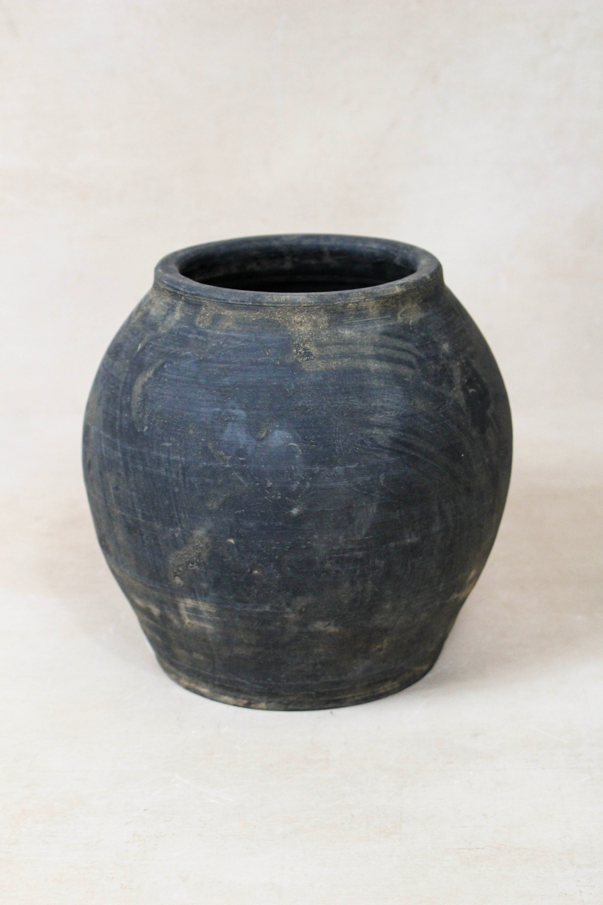 Vintage grey earthenware pot with signs of aging. These pots are hand made and are very decorative. They have a beautiful patina due to age. They are from the Shanxi province and crafted c. 1950's.