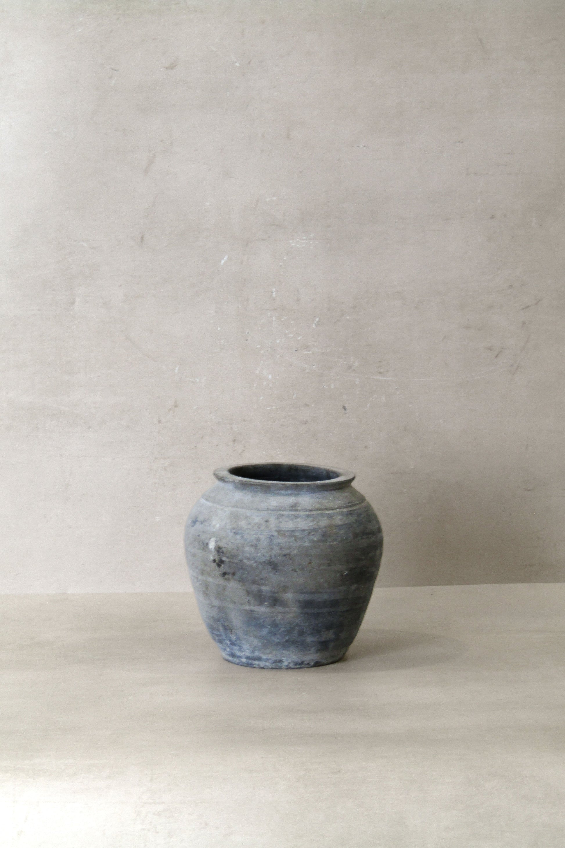 Vintage dark grey earthenware pot with signs of aging. These pots are hand made and are very decorative. They have a beautiful patina due to age. They are from the Shanxi province and crafted c. 1950's.