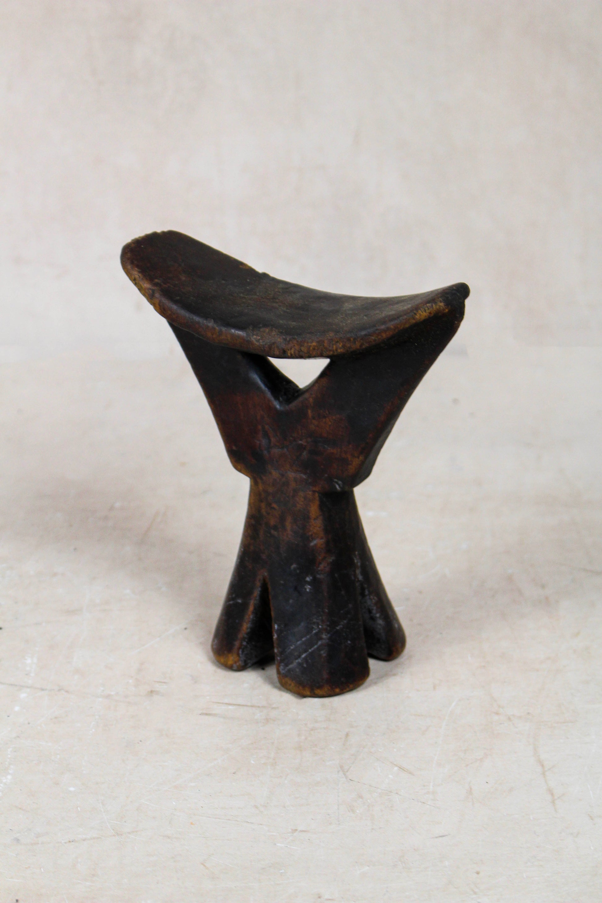 These solid wood Headrests are from groups in southern Ethiopia used to enable people to sleep without interfering with their complicated coiffure (hairstyles). Hairstyles frequently declare their owner's age, gender and status, and are often embellished by accoutrements of a magic-religious nature. Hairstyles therefore need protecting. The headrest also plays a role in nuptial ceremonies.