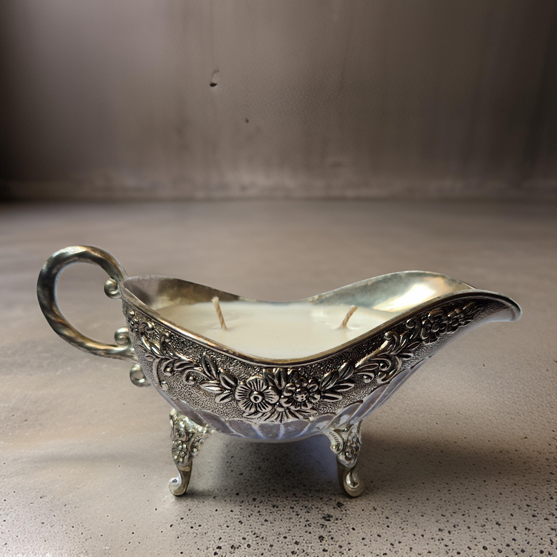 This ornate vintage gravy bowl has been beautifully repurposed into a Wild Fig & Oakmoss candle, blending rich notes of ripe fig and juicy plum with earthy oakmoss for a scent that is both sophisticated and uplifting.