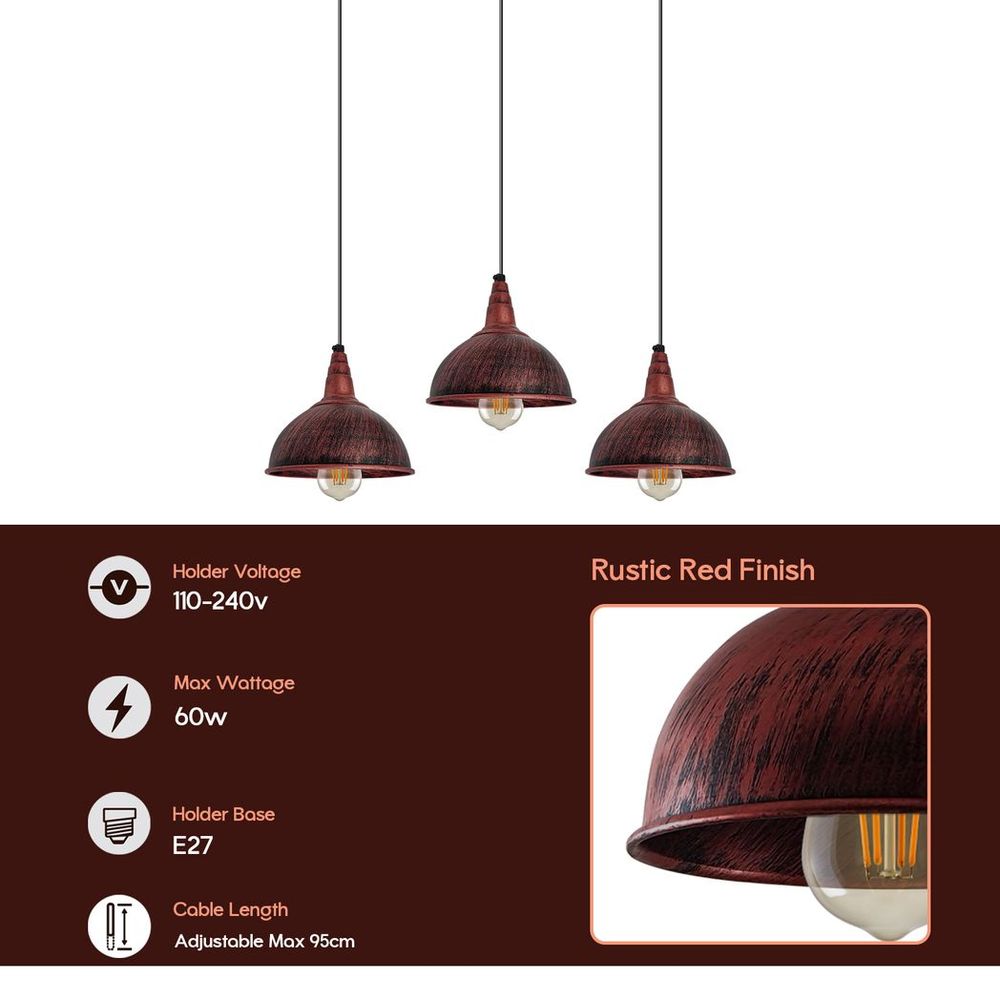 Vintage Industrial Rustic Red 3 Head Pendant - Metal Brushed Light Fitting - Small Dome Lamp Shade - E27 Base