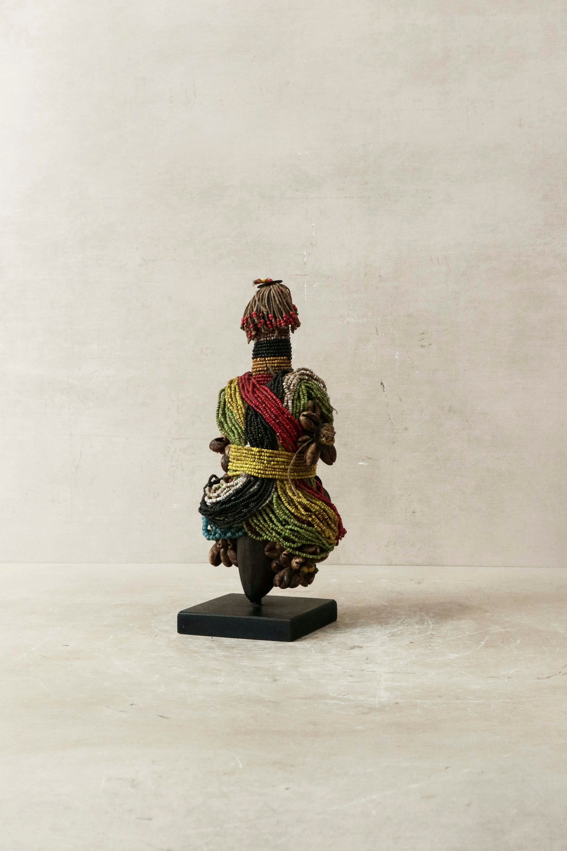 Intricate Adornments: The doll is adorned with multi-colored beads, metals, fibers, cowrie shells, coins, and leather, each element thoughtfully placed to enhance its aesthetic appeal. These embellishments not only add to its beauty but also reflect traditional practices.