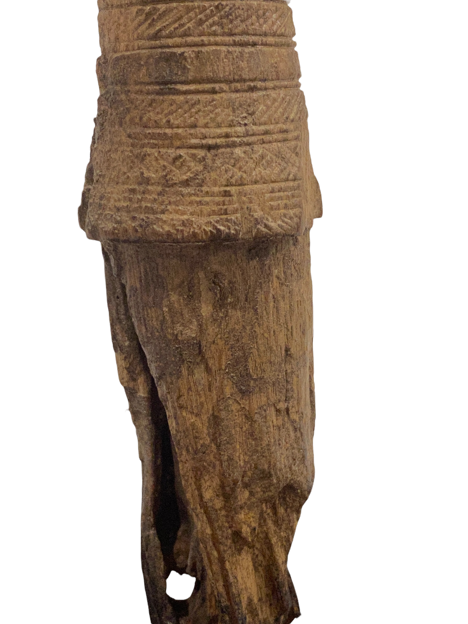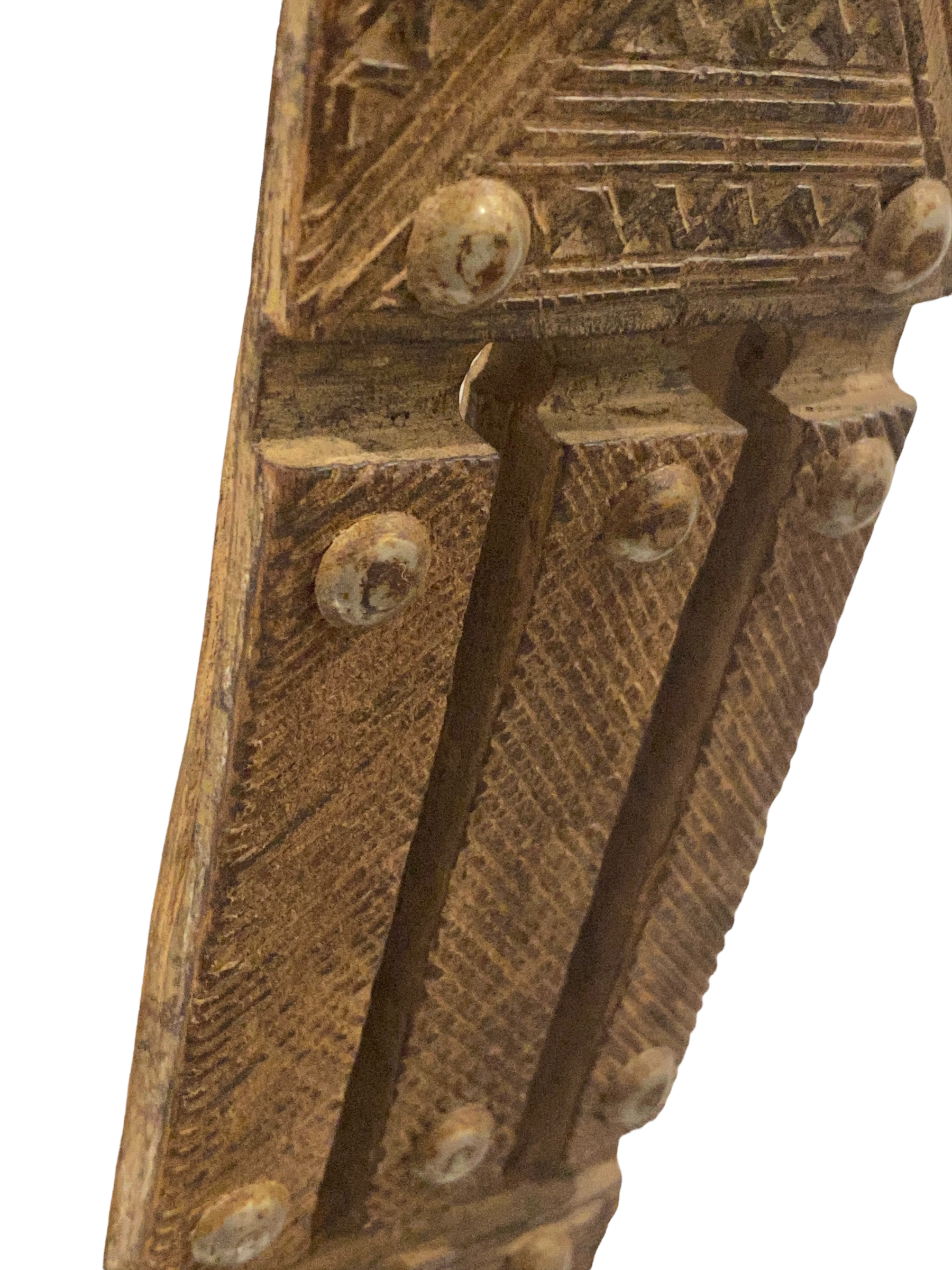 The stand is a very old piece made from detailed carved wood post. This post comes with a bespoke stand. The top is rounded to support a Taureg bowl, incorporating animal hide, raffia and metal tacks. Tuareg nomadic community, Sahara region being hand carved have their own unique designs, inlays of leather and copper.