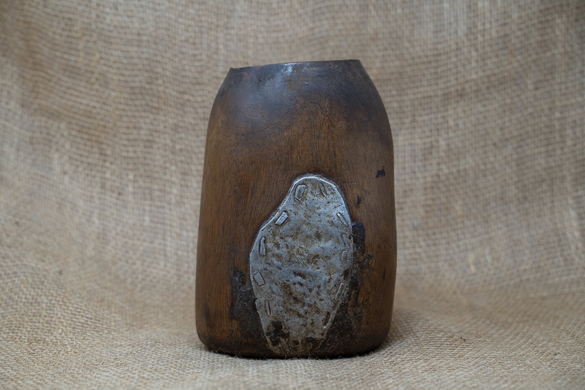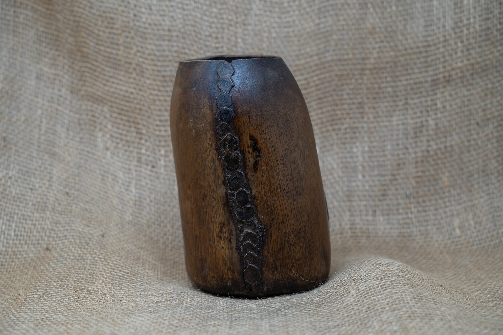 These ornate milk containers are masterfully hand-carved from a singular block of wood and accentuated with tin embellishments. These time-honored vessels have served as indispensable tools among the Tutsi people of Rwanda, as well as nomadic communities in the rural hinterlands of Burundi, Kenya, and Northern Tanzania. Originally devised for the conveyance of milk, water, honey, and provisions, these containers exude a versatile practicality.