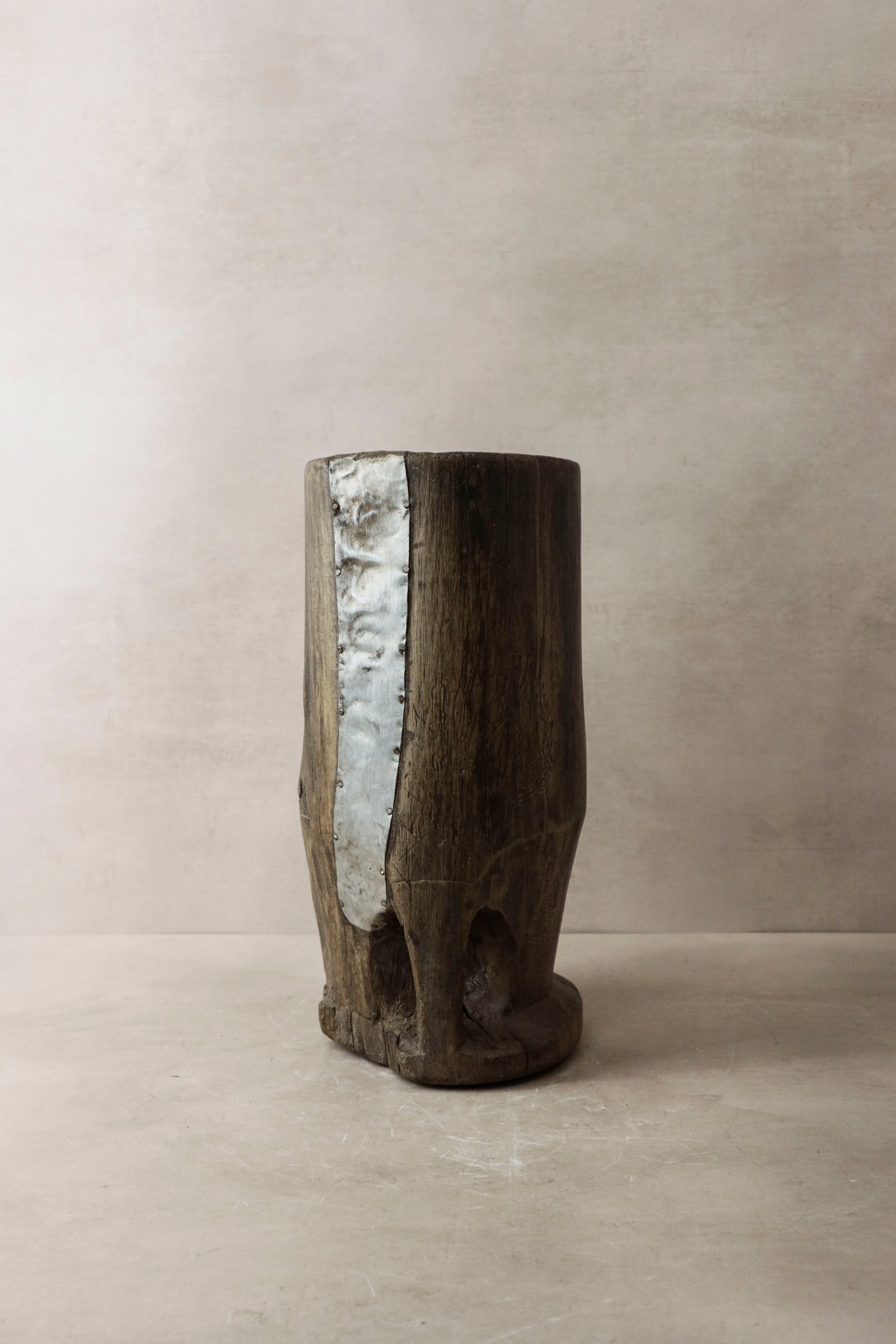 African grain stompers are hand-made when tree trunks are hollowed out and then used to grind grain. We recycle them to use as planters, vases or interior object with a rich history
