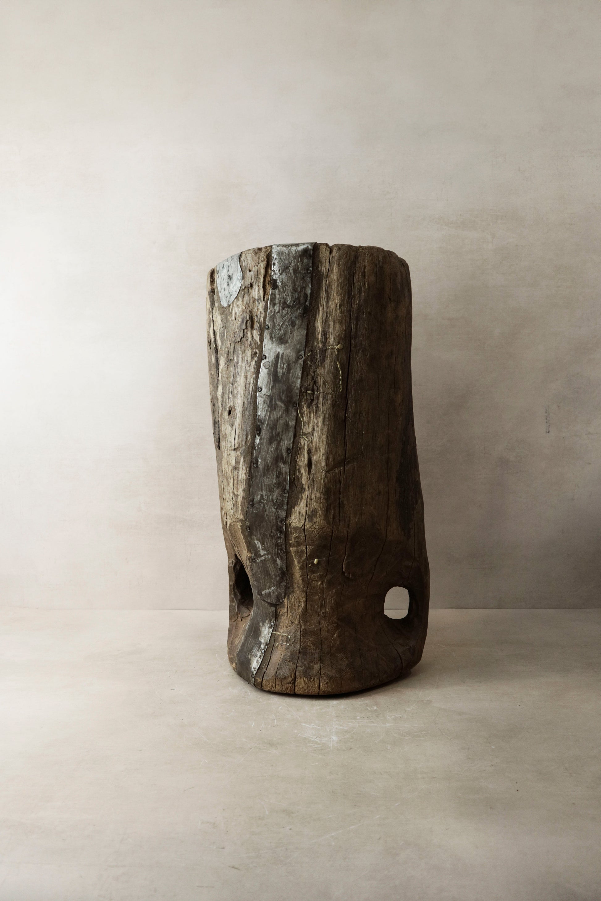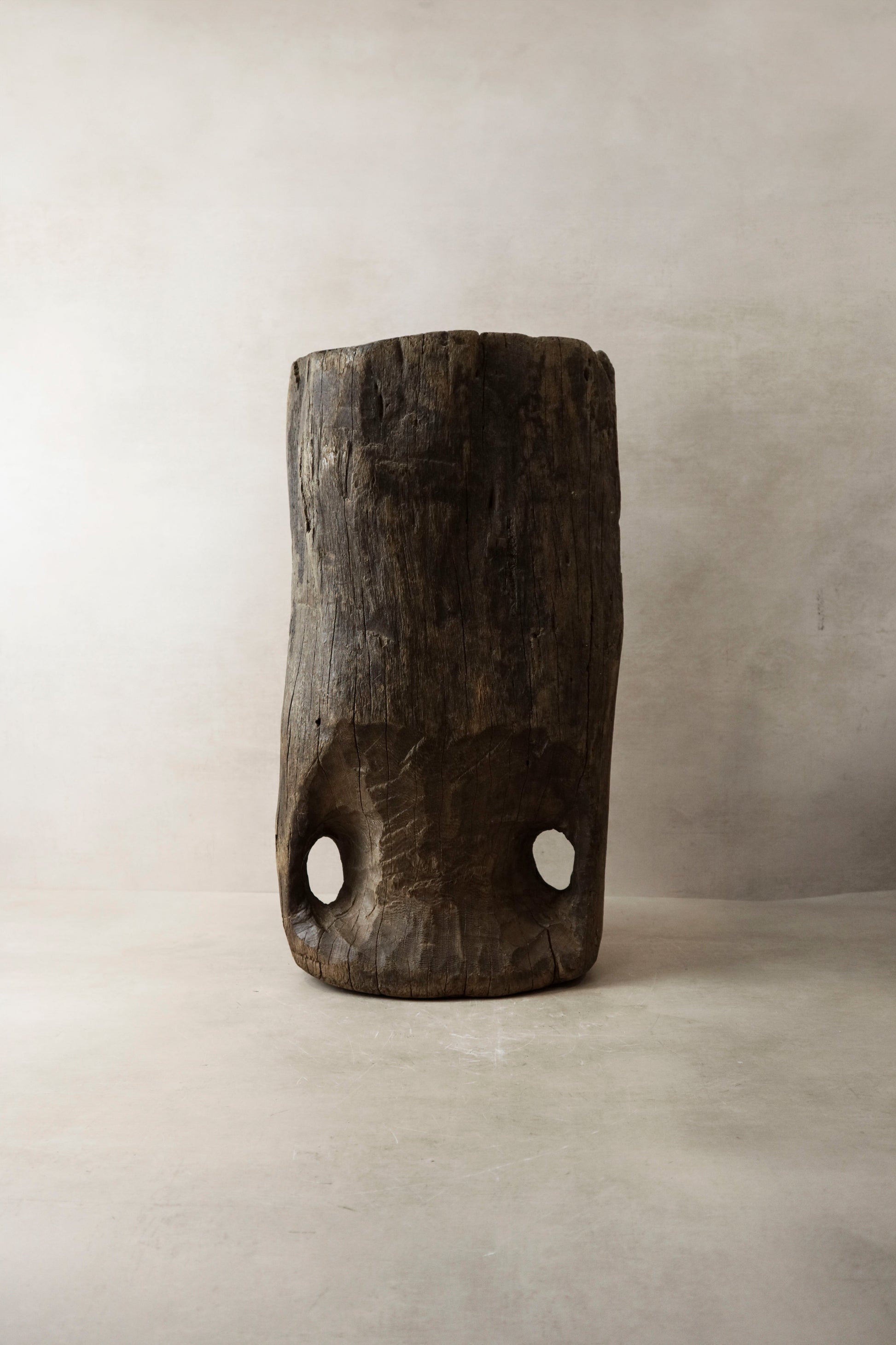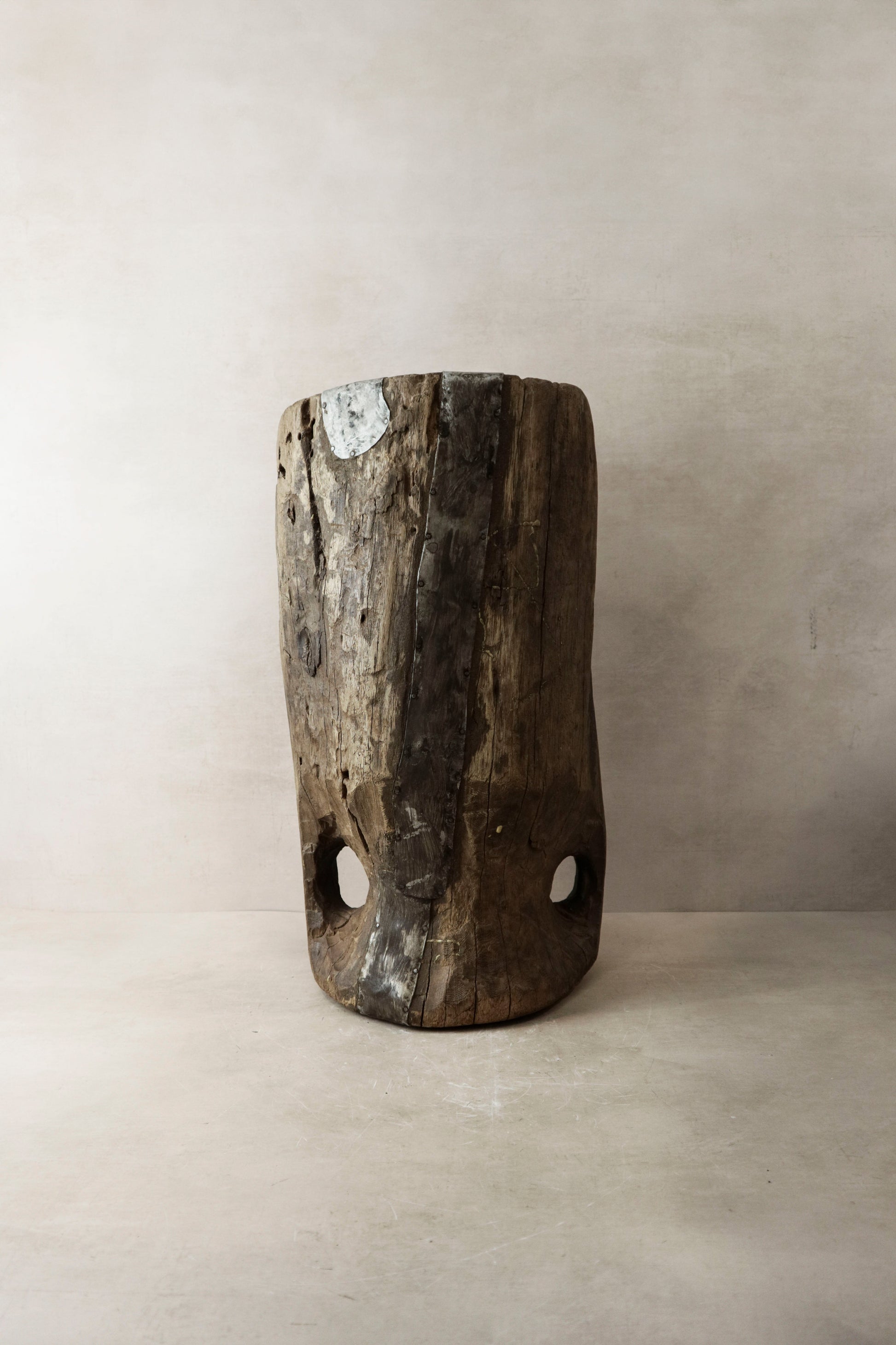 African grain stompers are hand-made when tree trunks are hollowed out and then used to grind grain. We recycle them to use as planters, vases or interior object with a rich history.