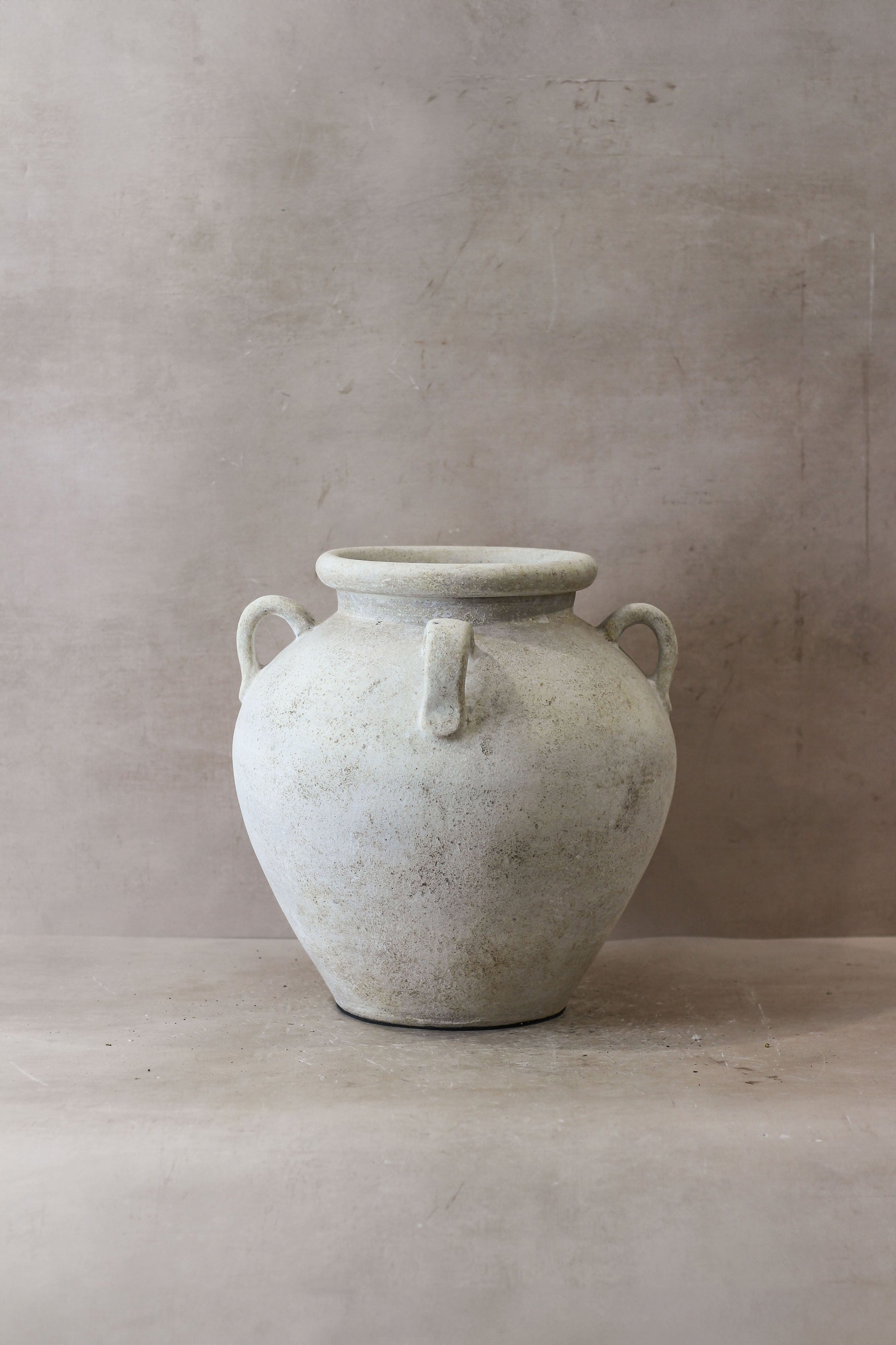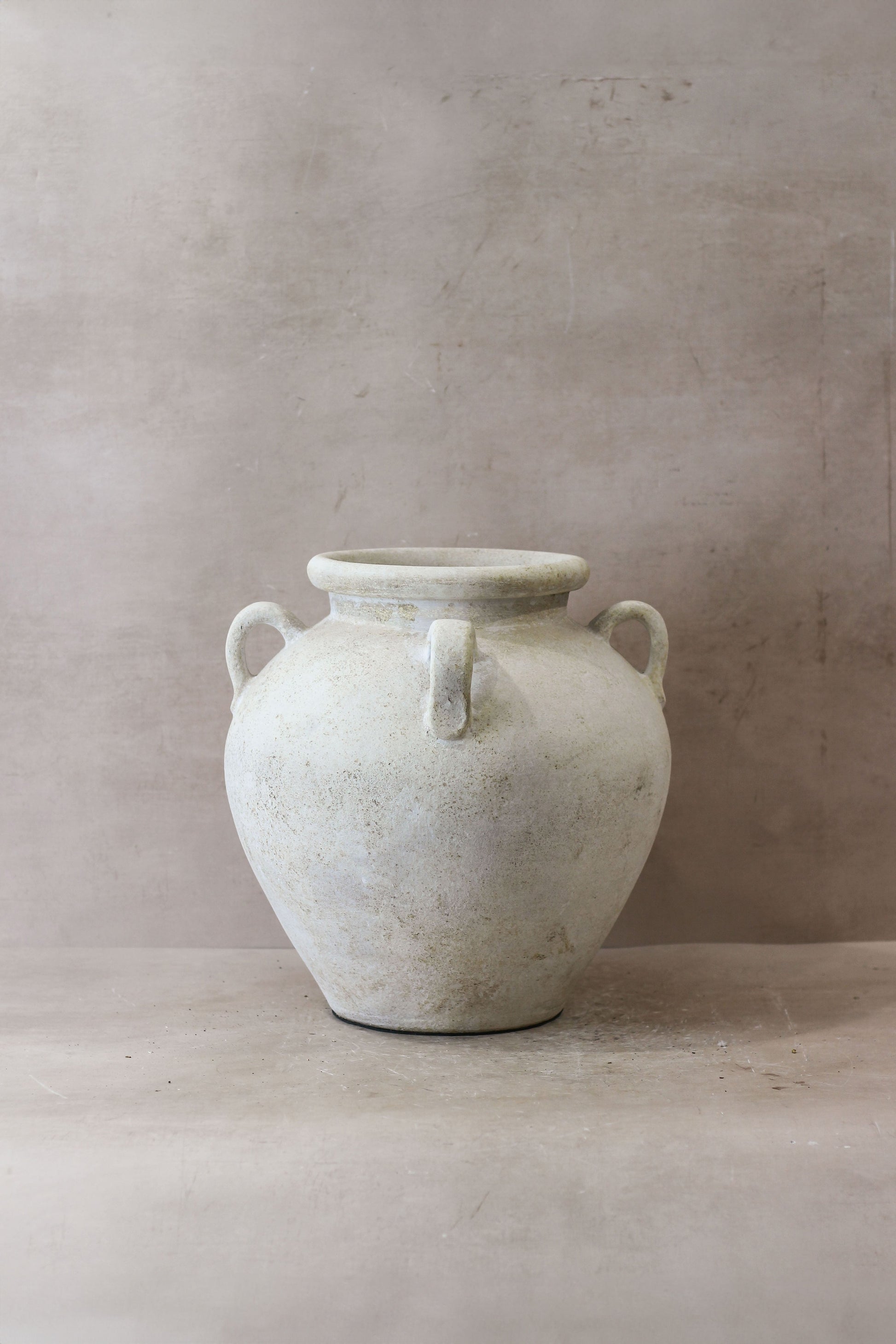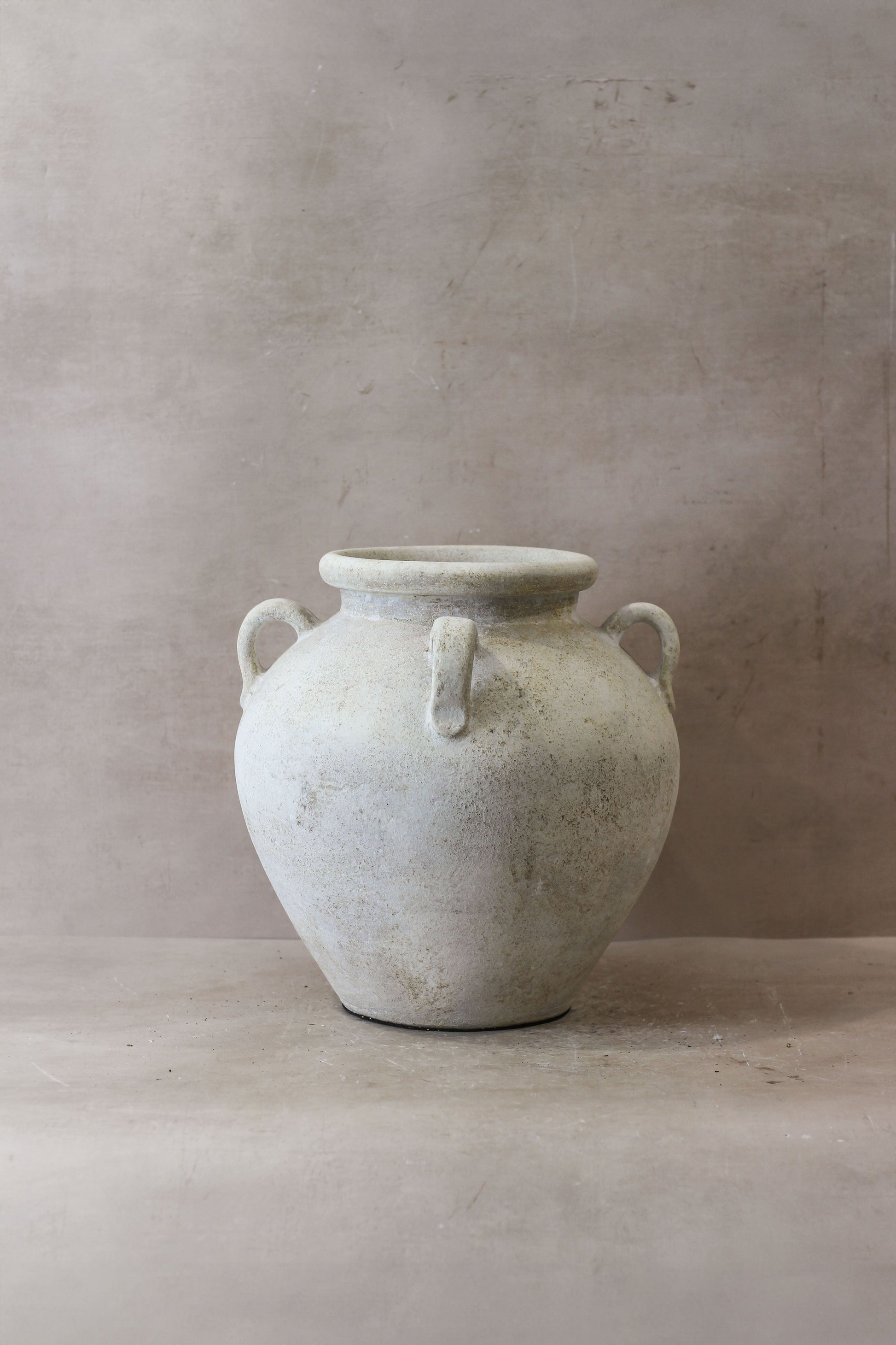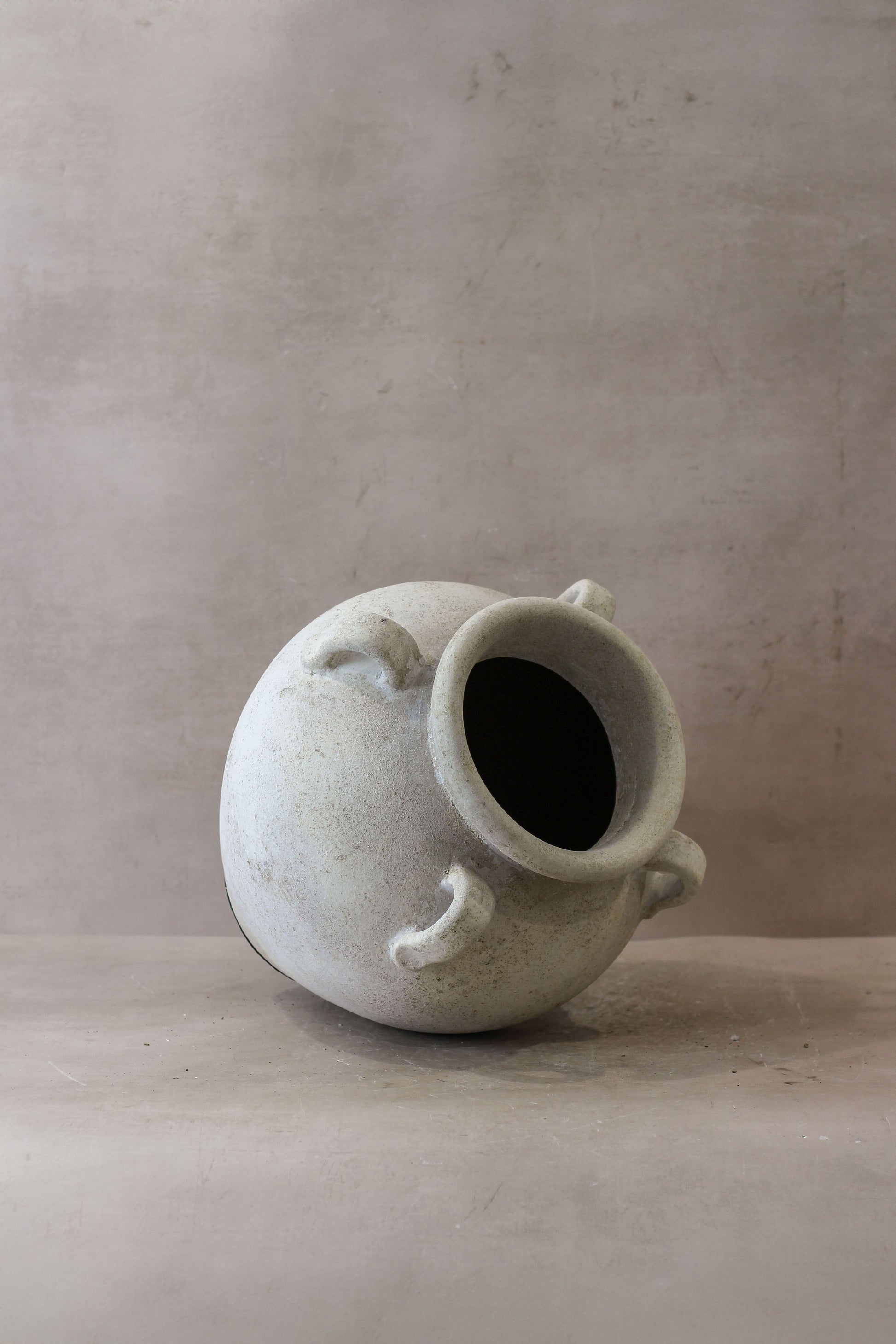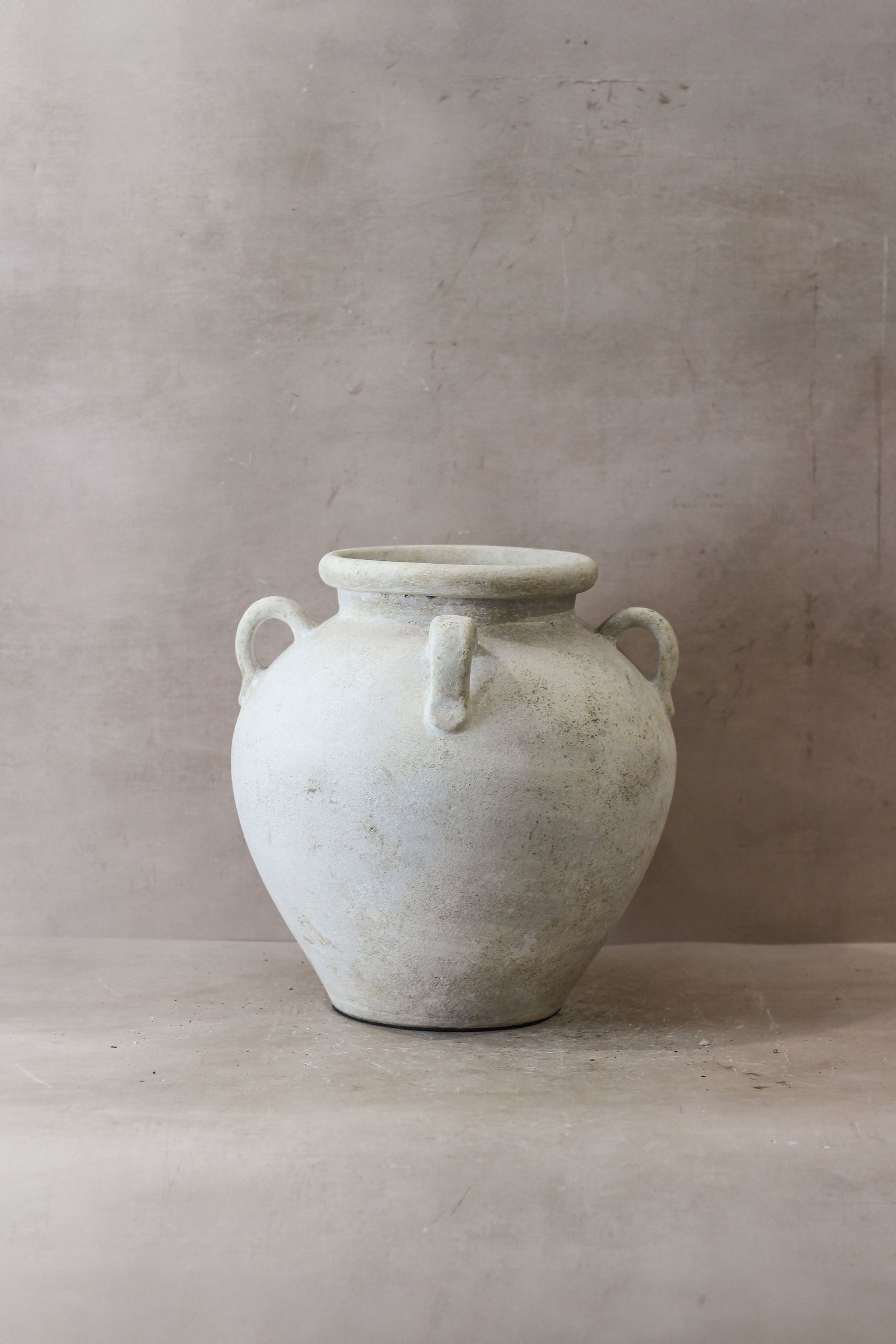 The white Indonesian pot boasts timeless charm with an antiqued white texture and rustic allure, highlighting rich clay craftsmanship. It's earthy tones and intriguing details make it a classic addition to your space. Embracing brutalist style, this vase's robust form and bold presence add raw elegance to your decor. Natural variation in the material and hand crafted pieces means no two are the same.