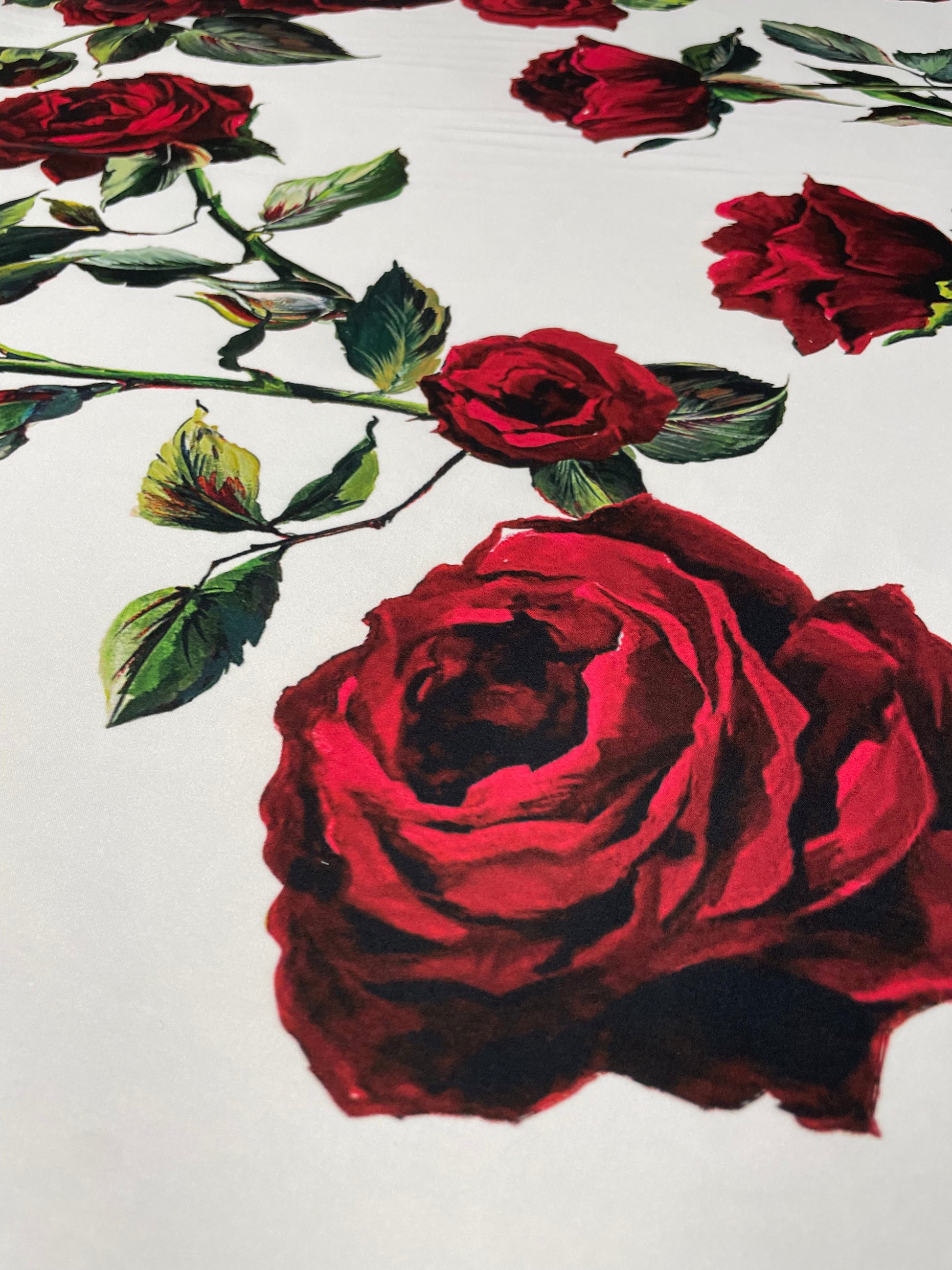 Romantic white satin fabric with elegant red rose floral print. Perfect for dresses, blouses, skirts, and statement sewing projects with timeless charm.