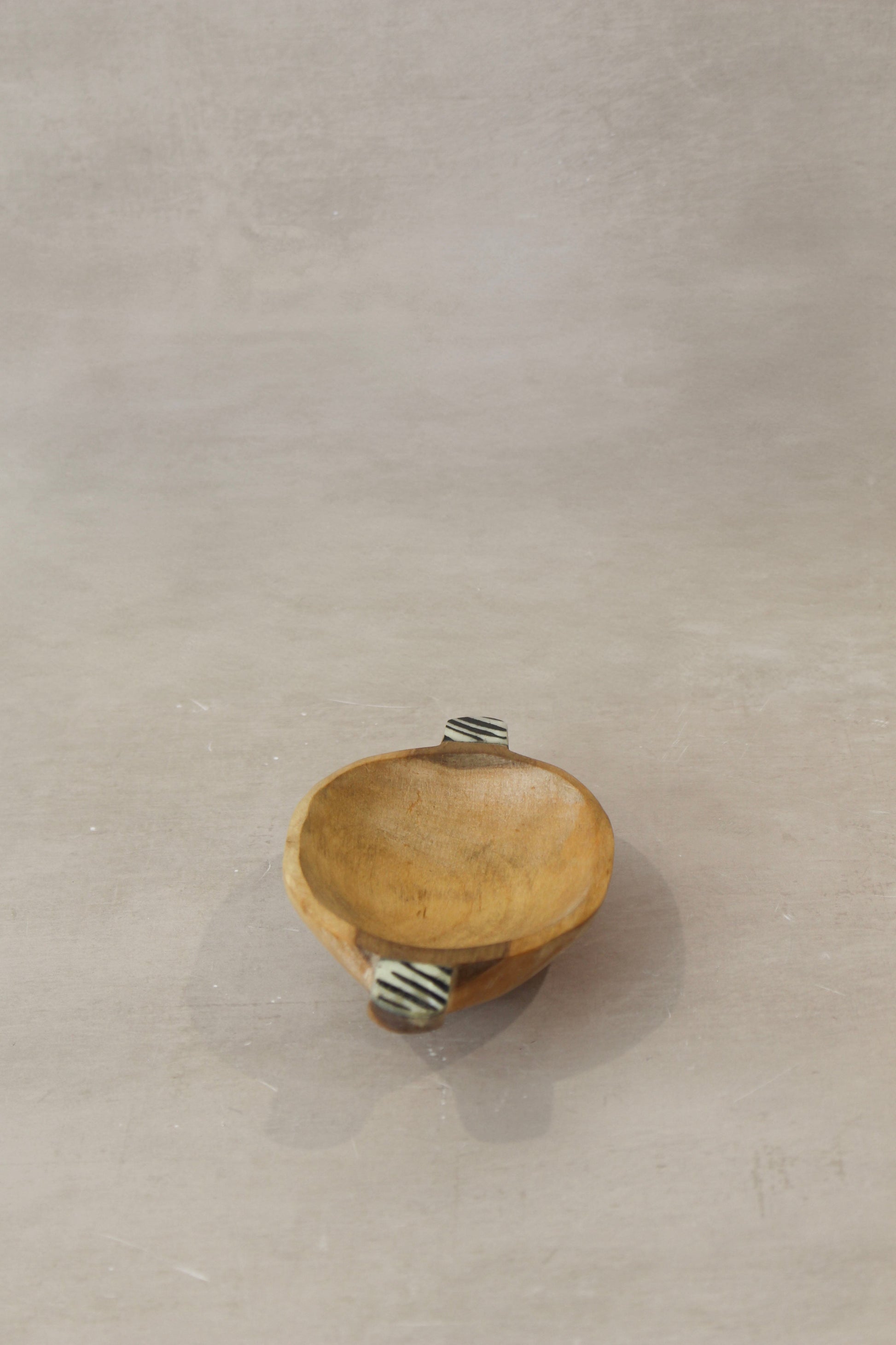 Hand carved bone inlay dipping bowl made in Kenya. The bowls are great for serving dips/spreads, holding spices, or used as decoration around your home. The bowl has a small flat base on the bottom to keep it balanced