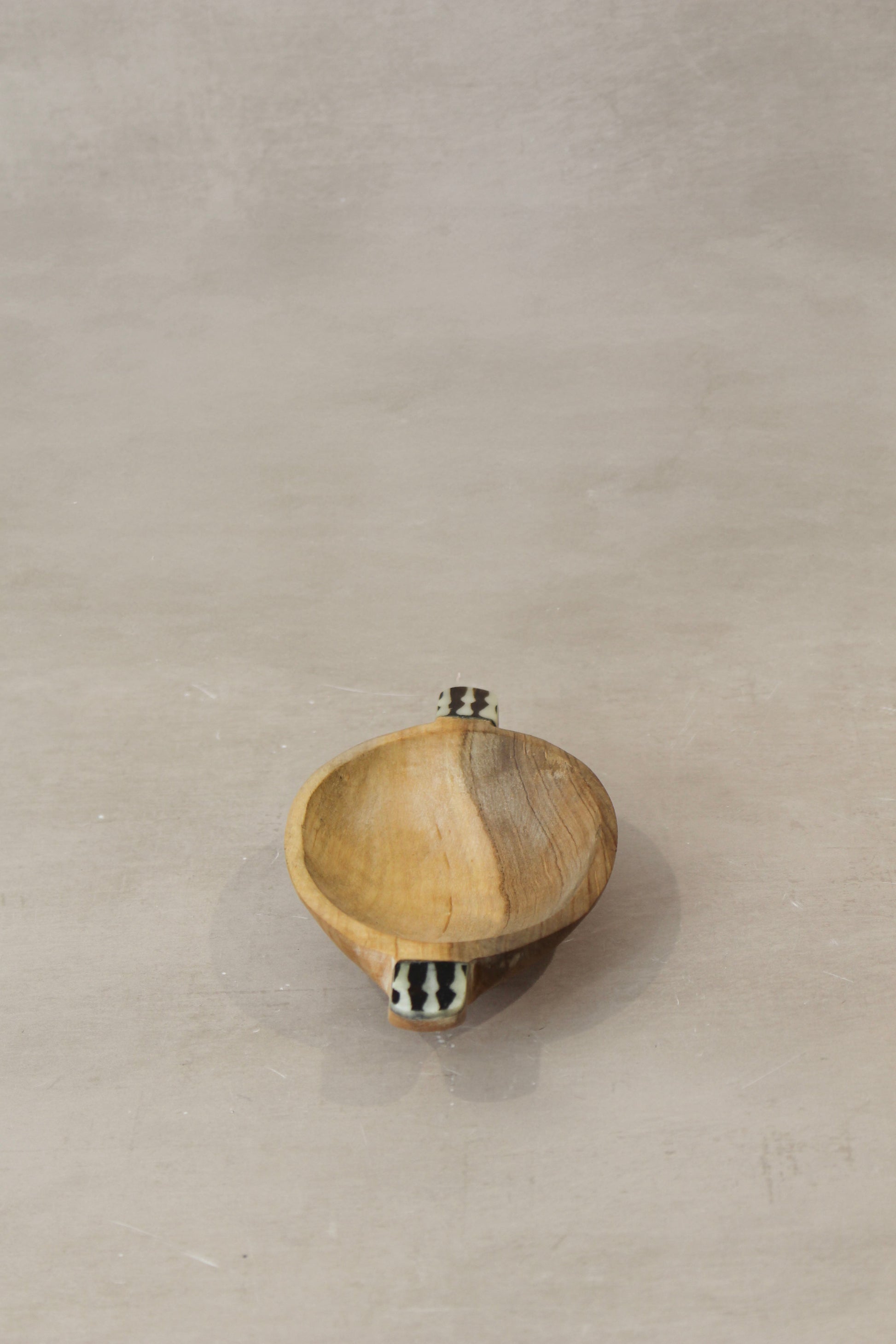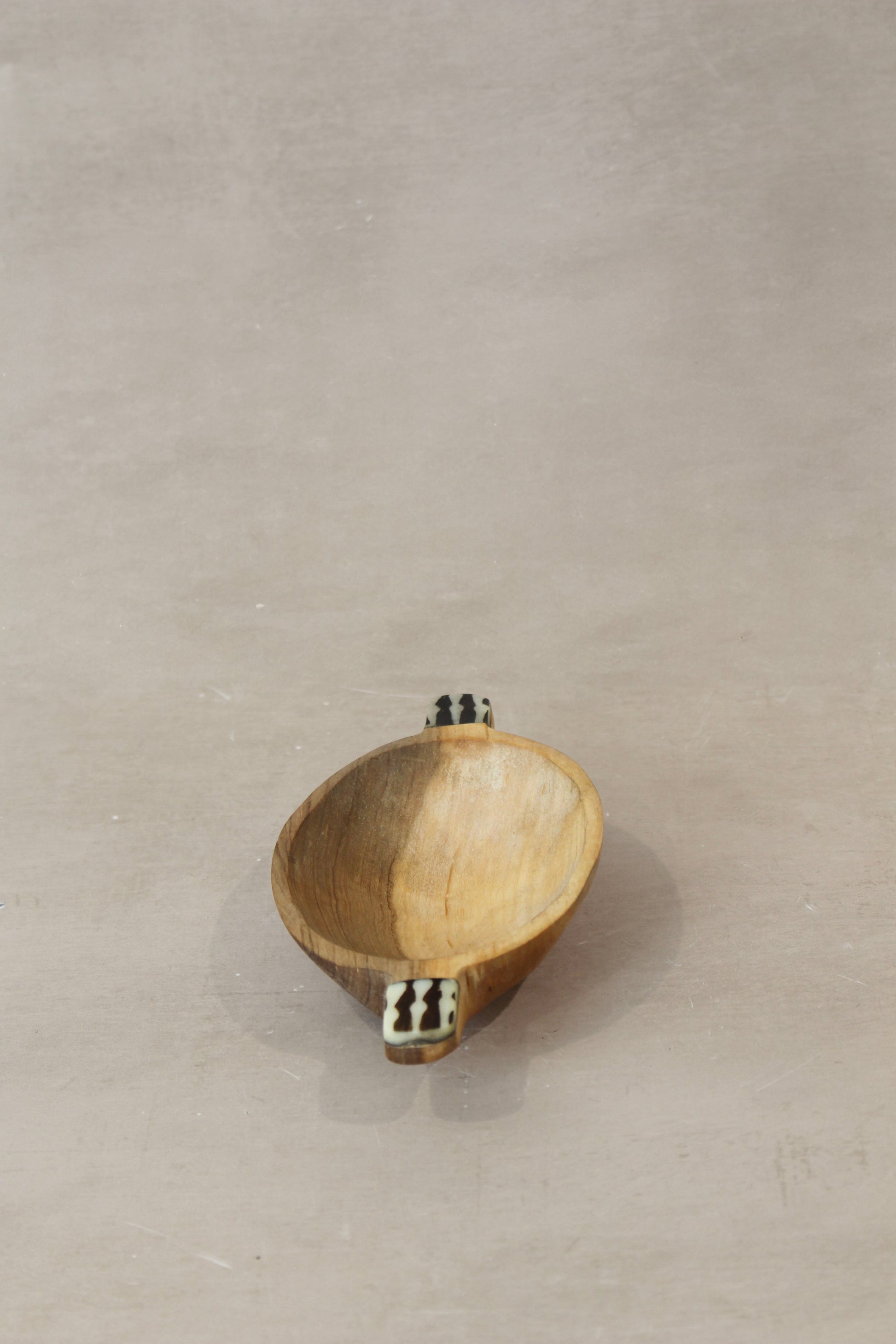 Hand carved bone inlay dipping bowl made in Kenya. The bowls are great for serving dips/spreads, holding spices, or used as decoration around your home. The bowl has a small flat base on the bottom to keep it balanced