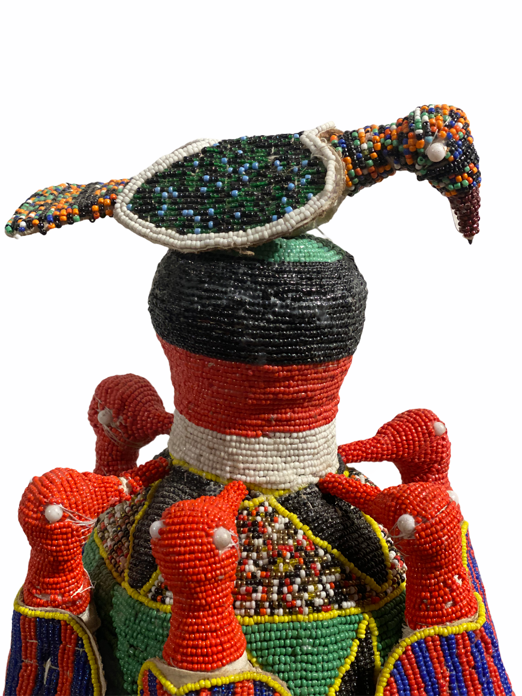 These elaborately decorated beadwork crowns are worn by chiefs on ceremonial occasions where it is believed they aid him in taking on supernatural abilities.