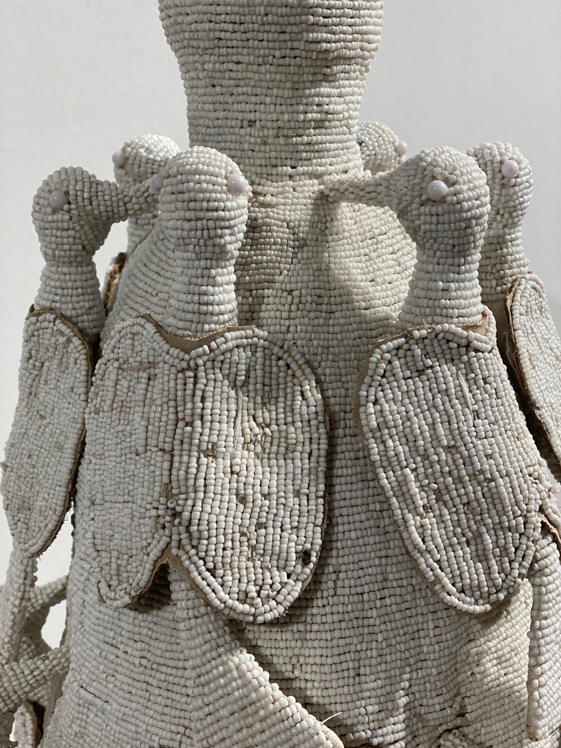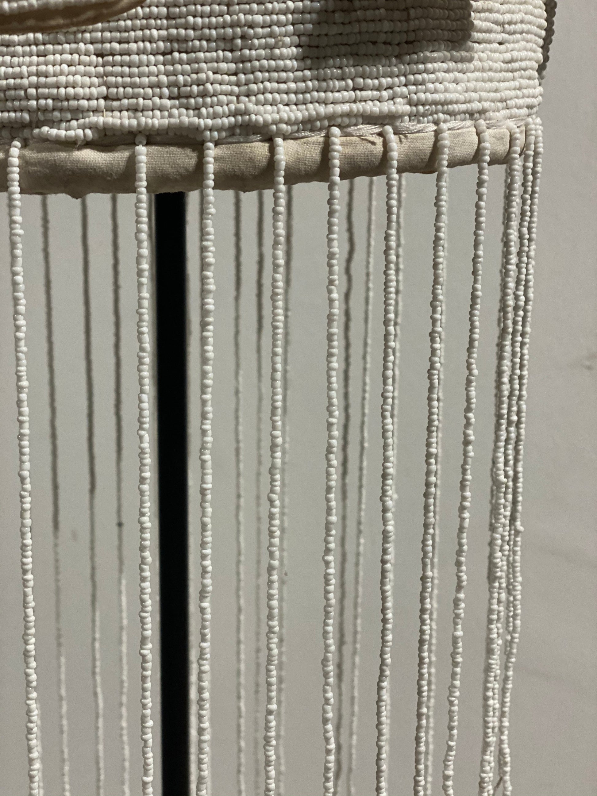 The crowns frequently have a fringe of beads that hang over the wearers face. This creates a veil that is believed to screen those viewing the proceedings from the overwhelming glory of the chief in this godlike aspect.