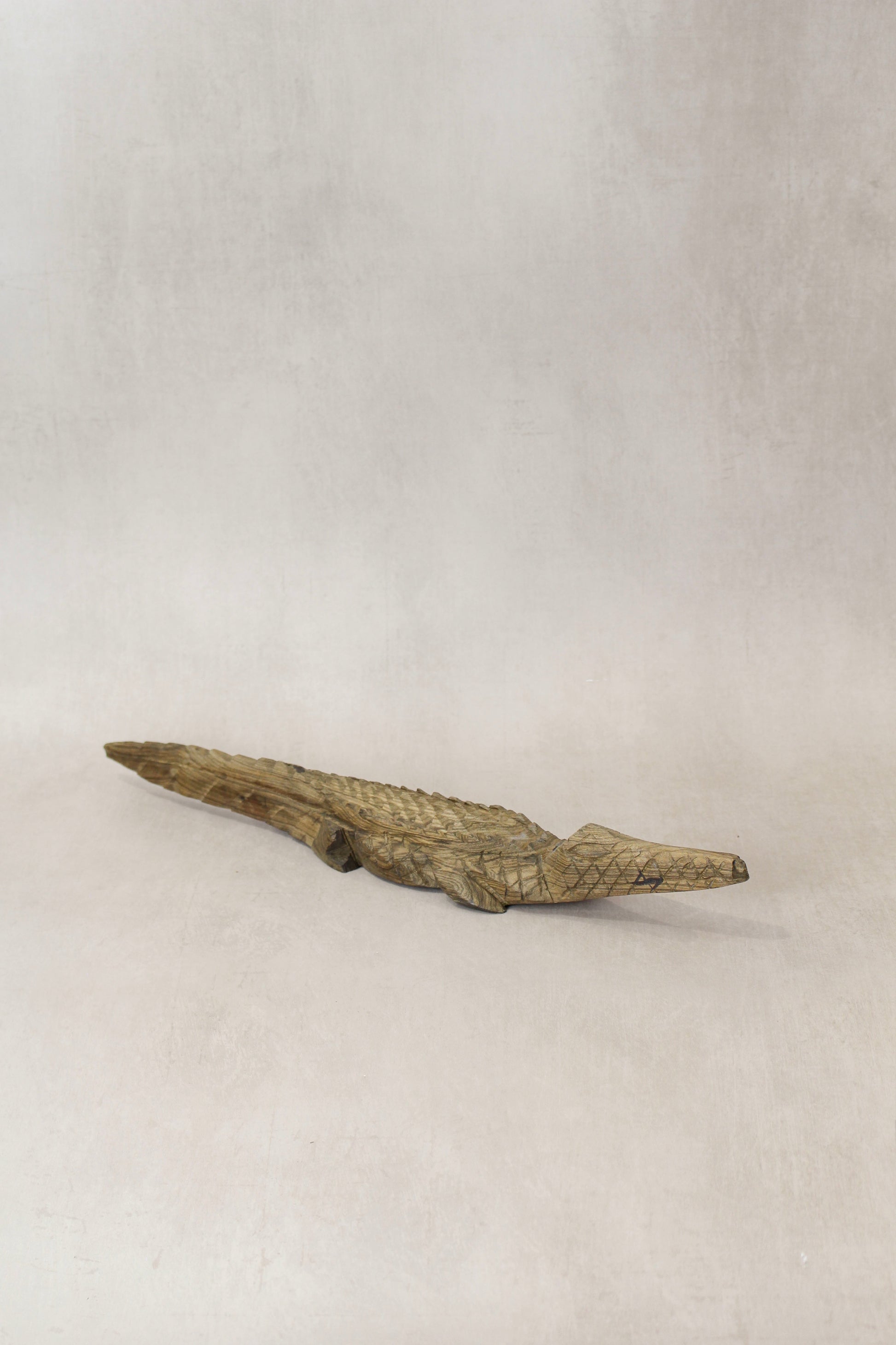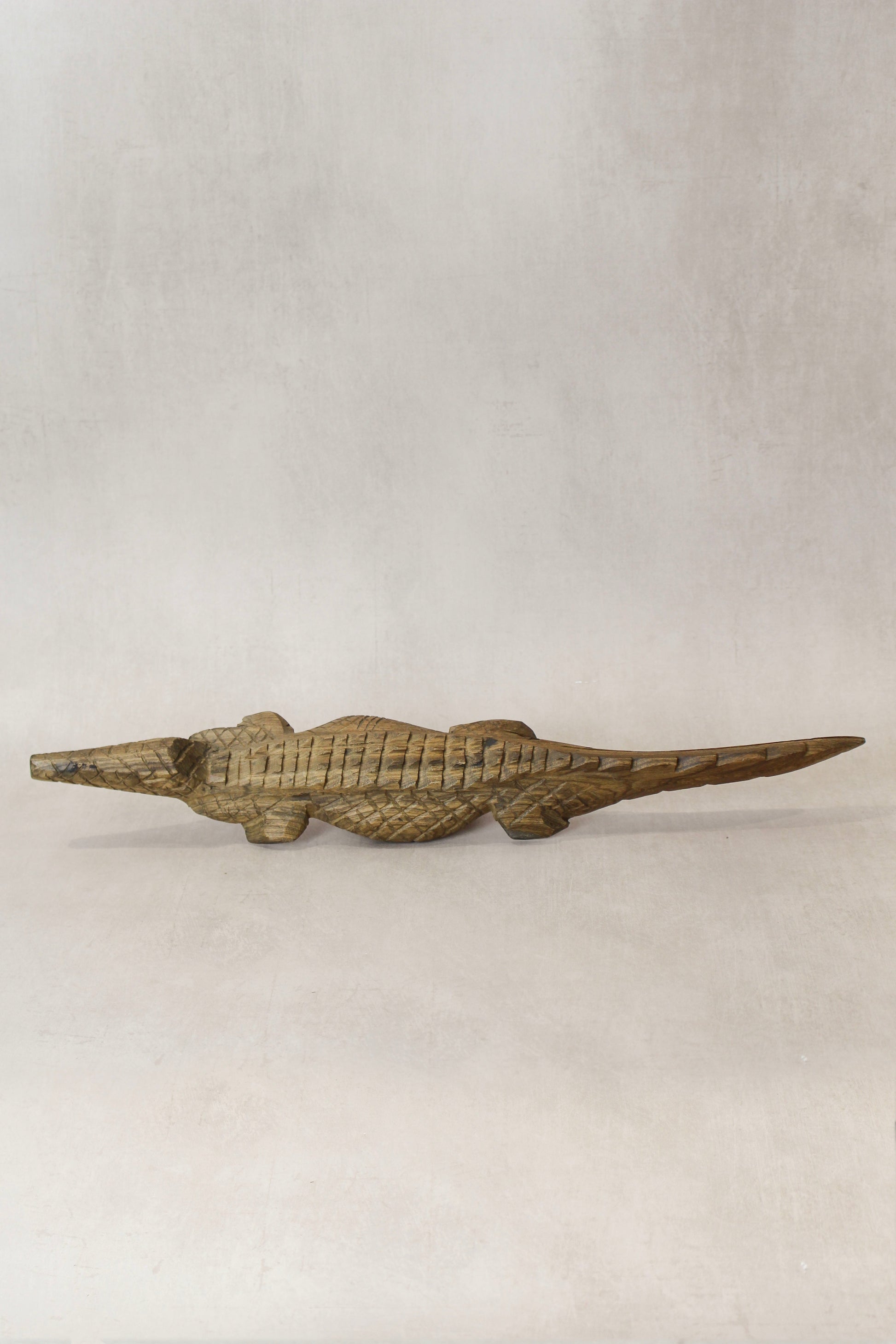 These hand carved life-size baby crocodiles are hand carved from Kola wood. This last remaining one has a curved tail at the end.