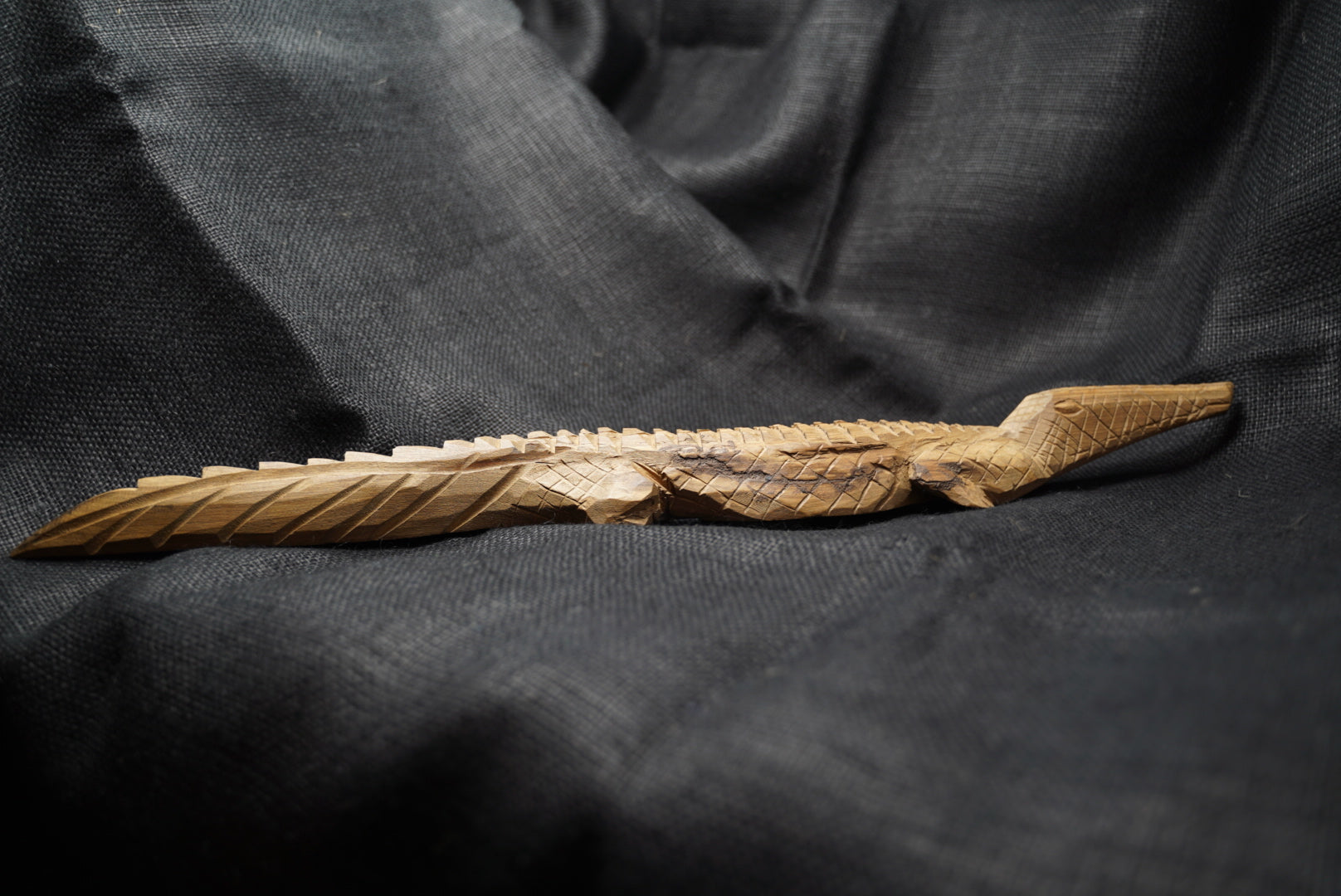 These hand carved life-size baby crocodiles are hand carved from Kola wood. This last remaining one has a curved tail at the end.