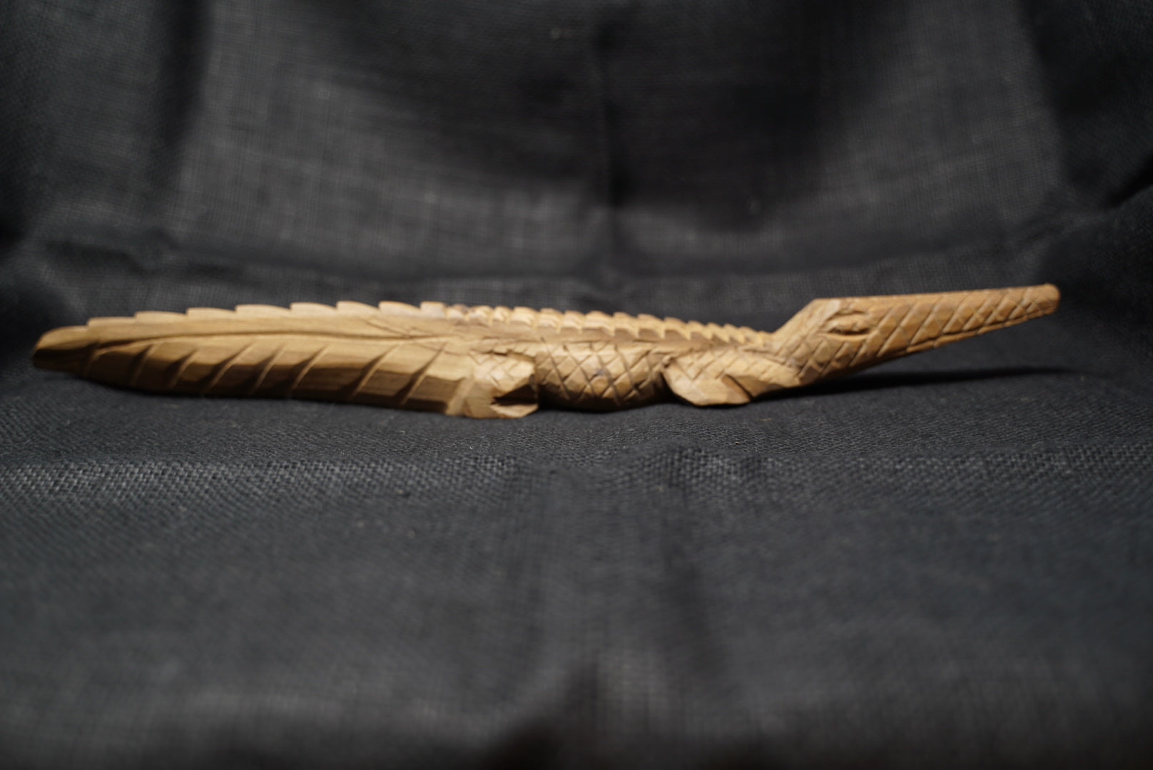 These hand carved life-size baby crocodiles are hand carved from Kola wood. This last remaining one has a curved tail at the end.