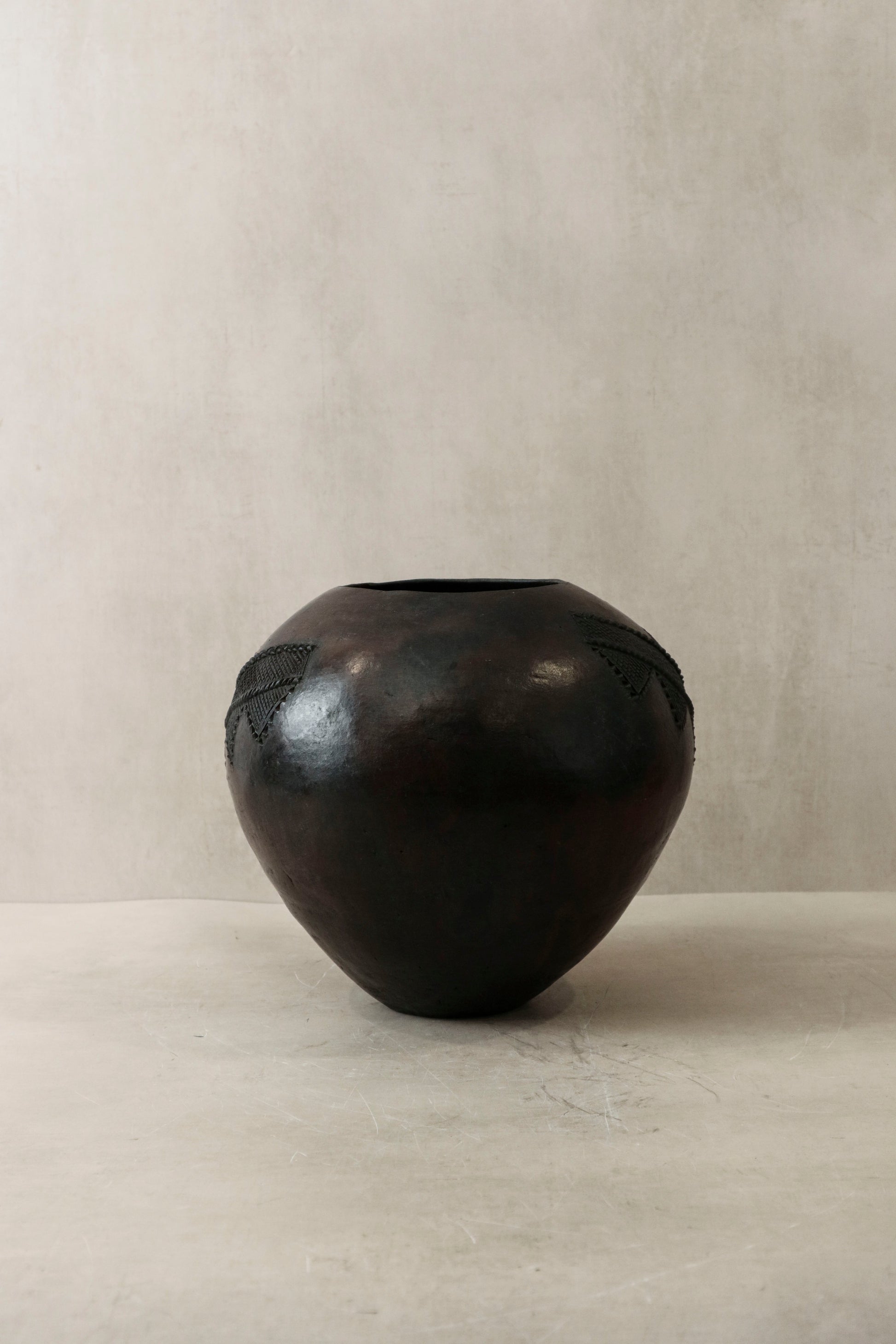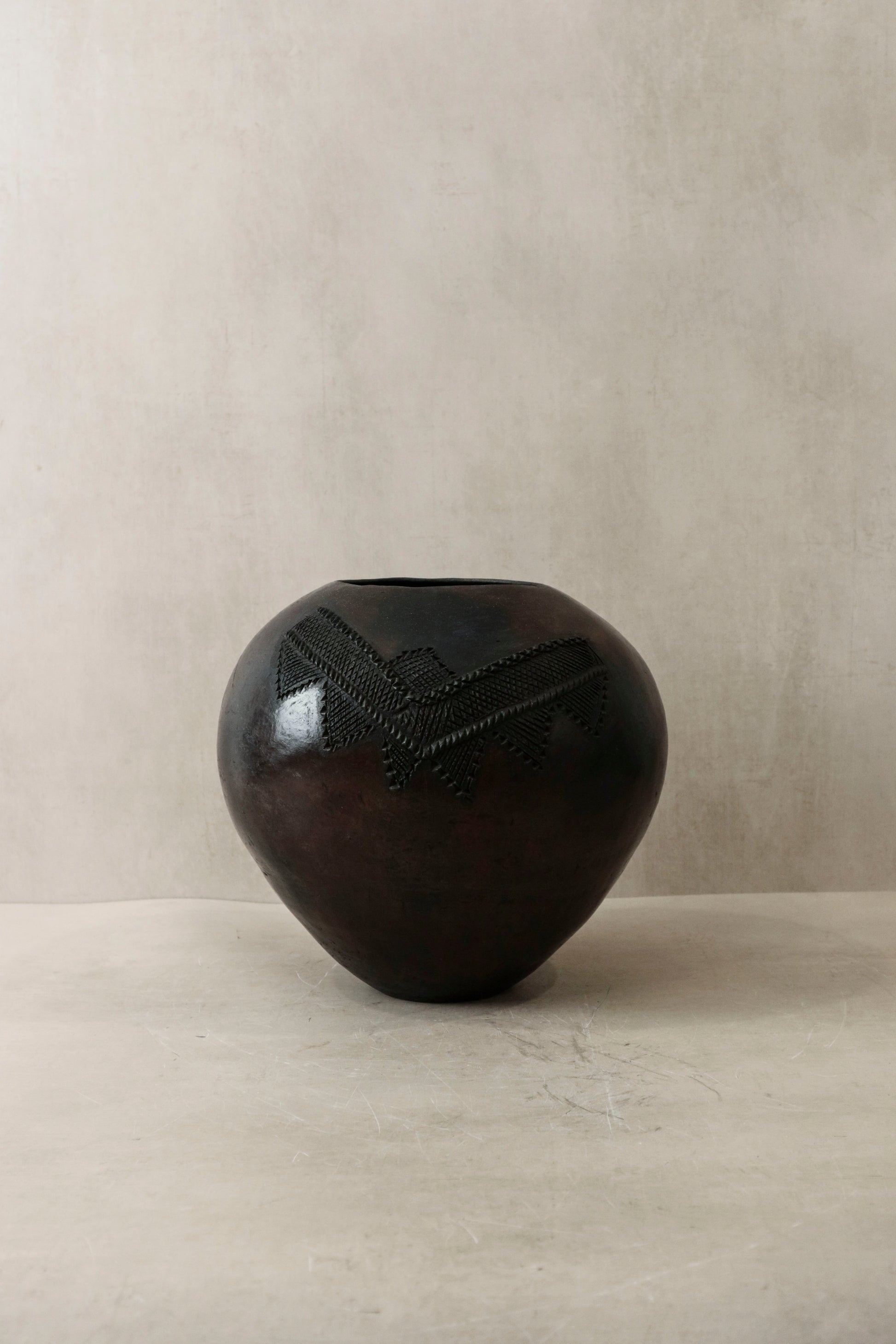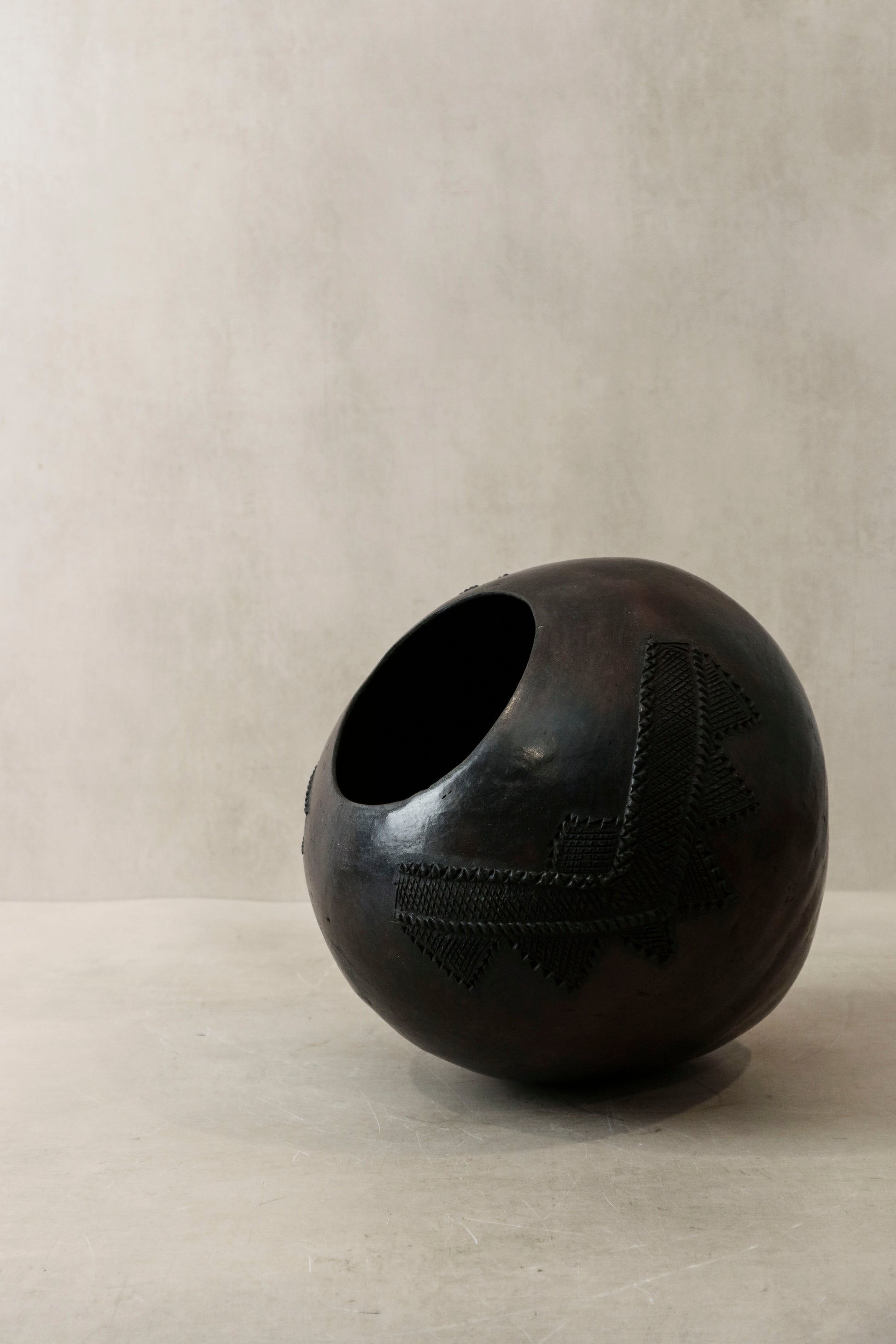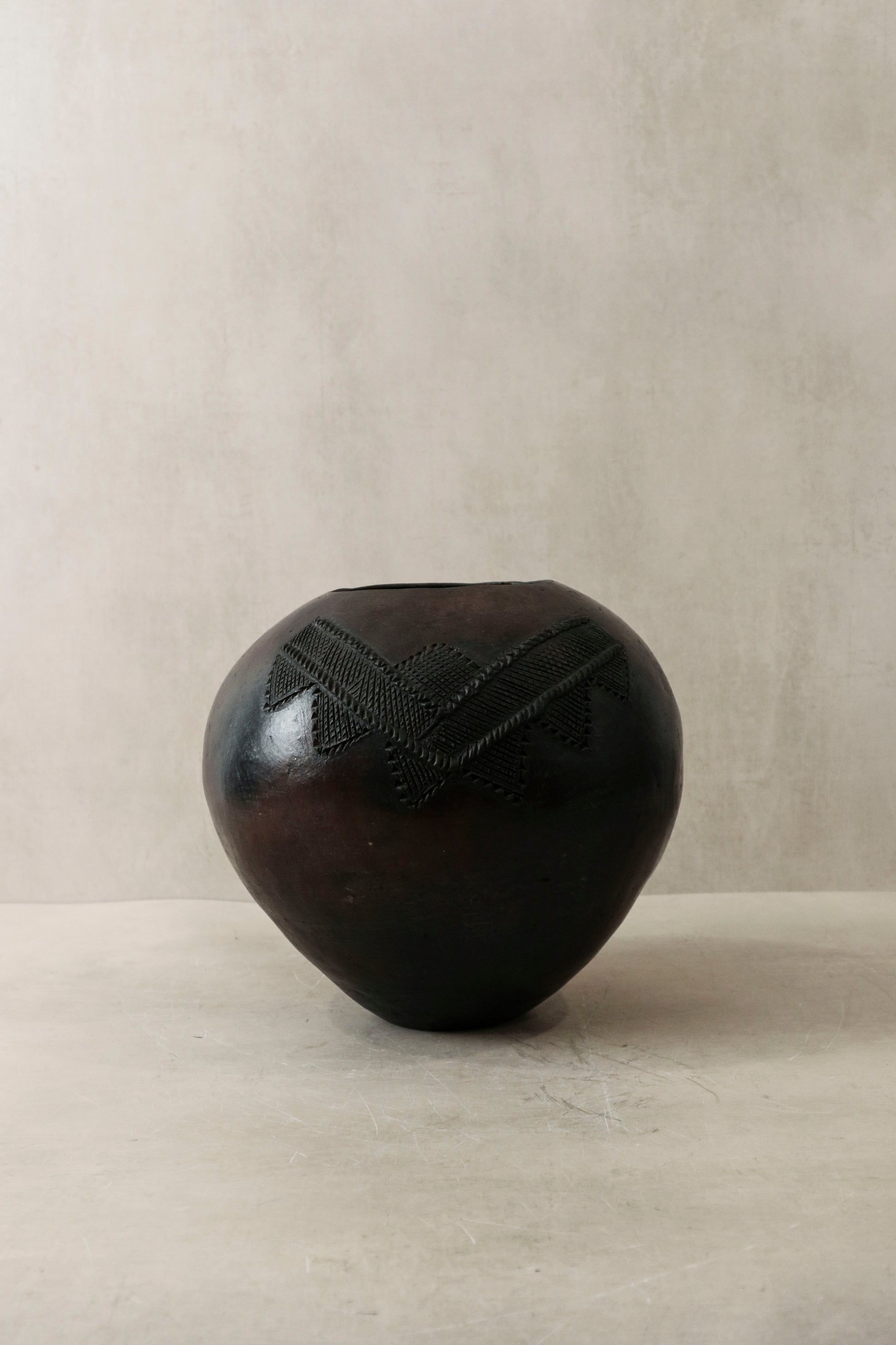 The Zulu pot, originating from South Africa, holds a distinguished role in the traditional practices of the Zulu people, primarily as vessels for the storage and consumption of beer. Crafted meticulously from clay harvested from the banks of local rivers, these pots undergo a meticulous hand-shaping process, followed by careful smoothing, culminating in firing over open-air fire pits. This time-honored technique not only imparts durability but also infuses each vessel with a distinctive character reflective of its artisan's cultural heritage, rendering every pot a unique testament to the rich tapestry of Zulu tradition.