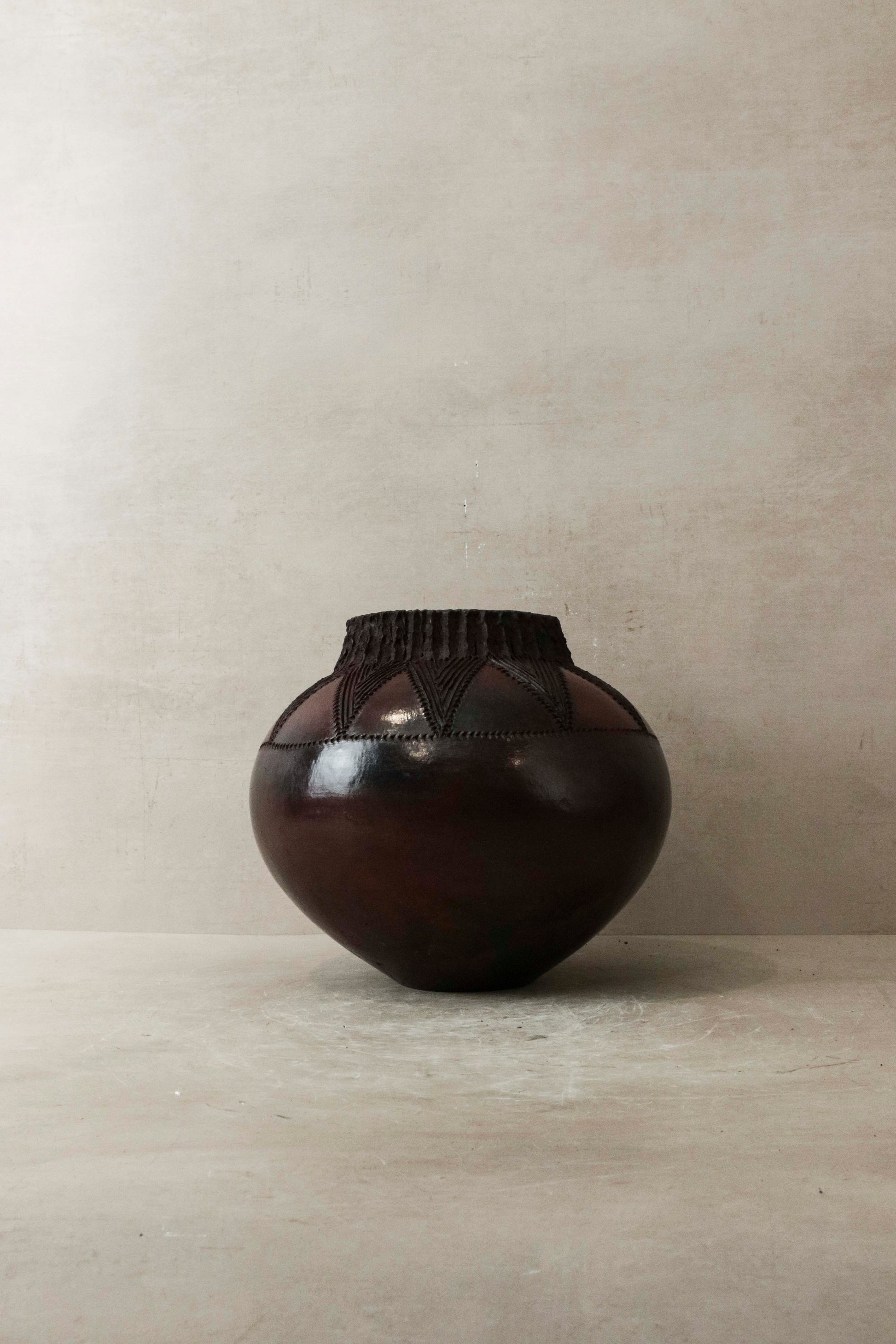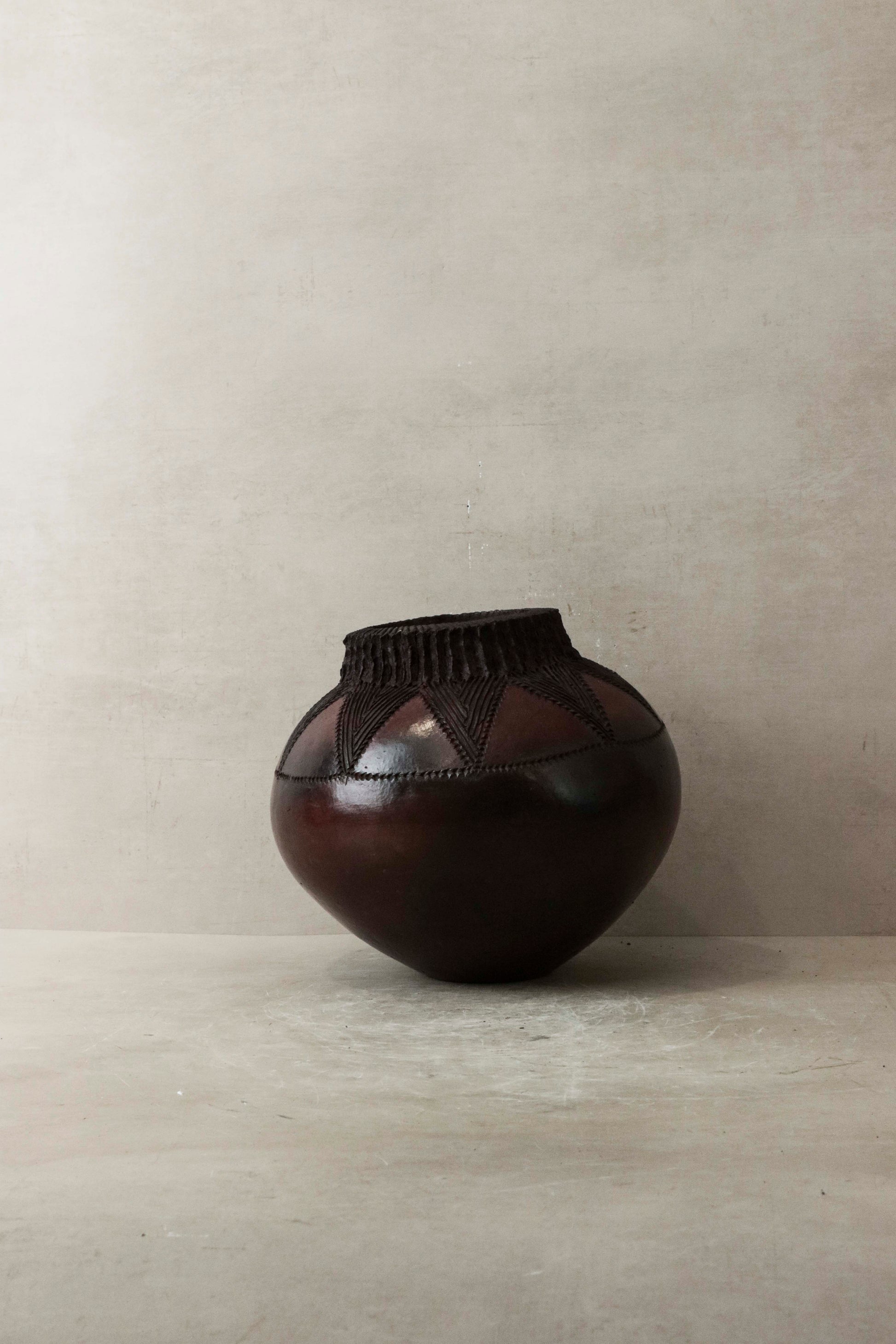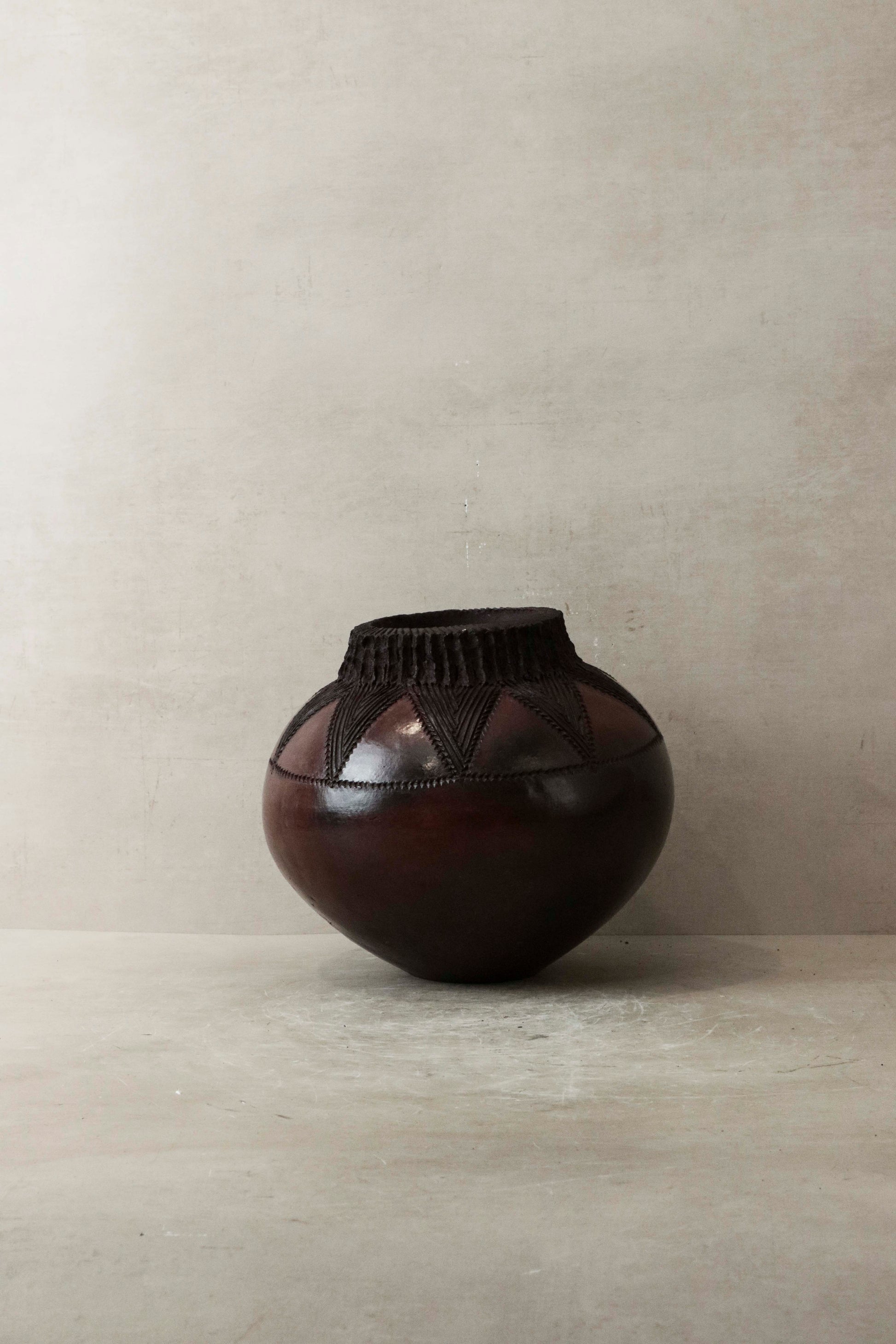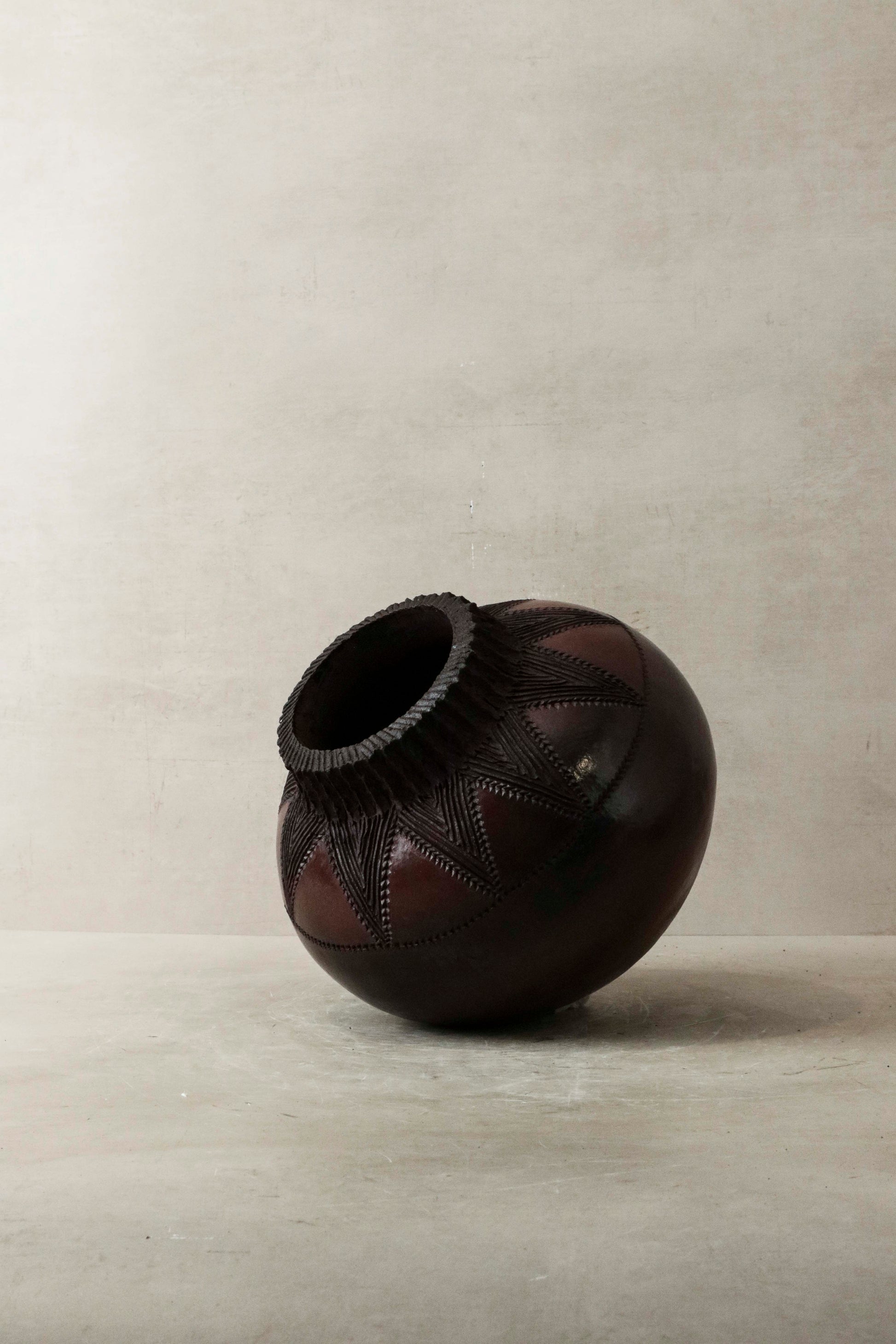 The Zulu pot, originating from South Africa, holds a distinguished role in the traditional practices of the Zulu people, primarily as vessels for the storage and consumption of beer. Crafted meticulously from clay harvested from the banks of local rivers, these pots undergo a meticulous hand-shaping process, followed by careful smoothing, culminating in firing over open-air fire pits. This time-honored technique not only imparts durability but also infuses each vessel with a distinctive character reflective of its artisan's cultural heritage, rendering every pot a unique testament to the rich tapestry of Zulu tradition.