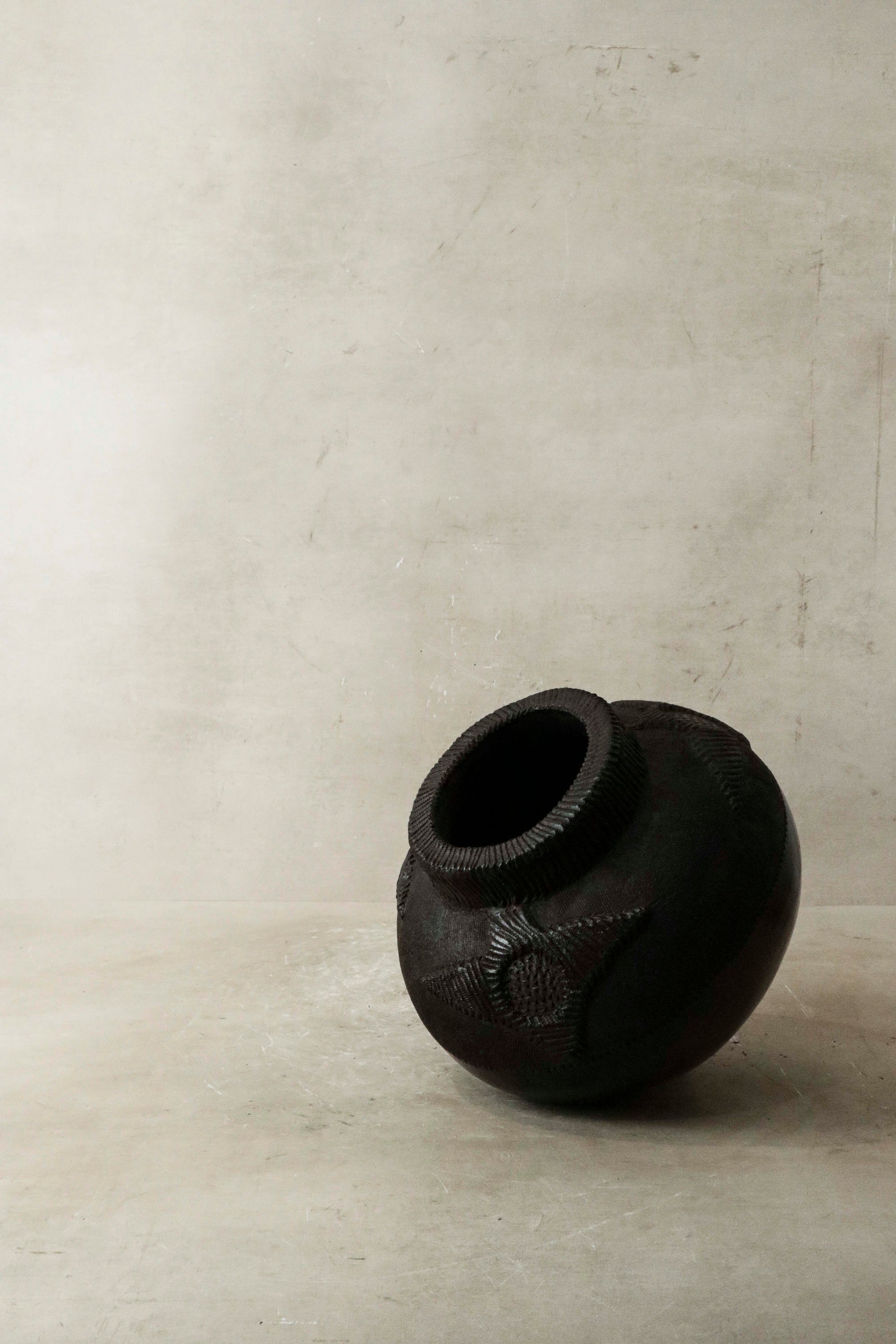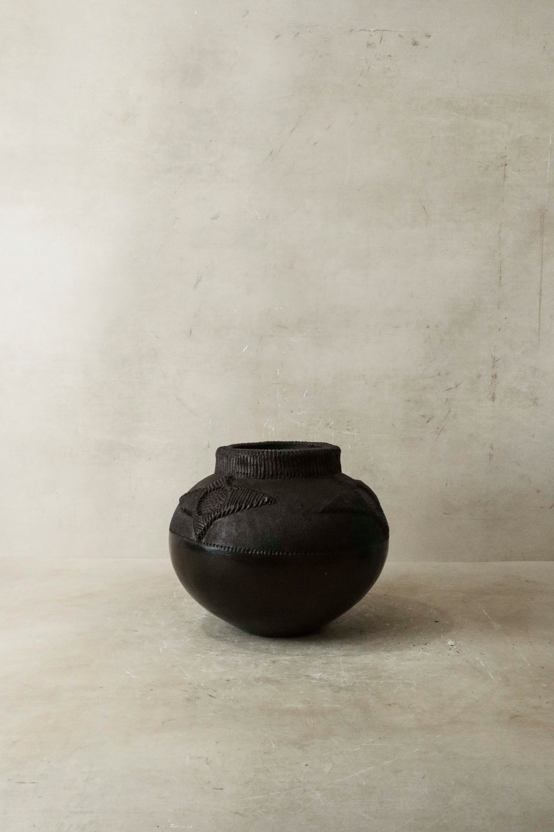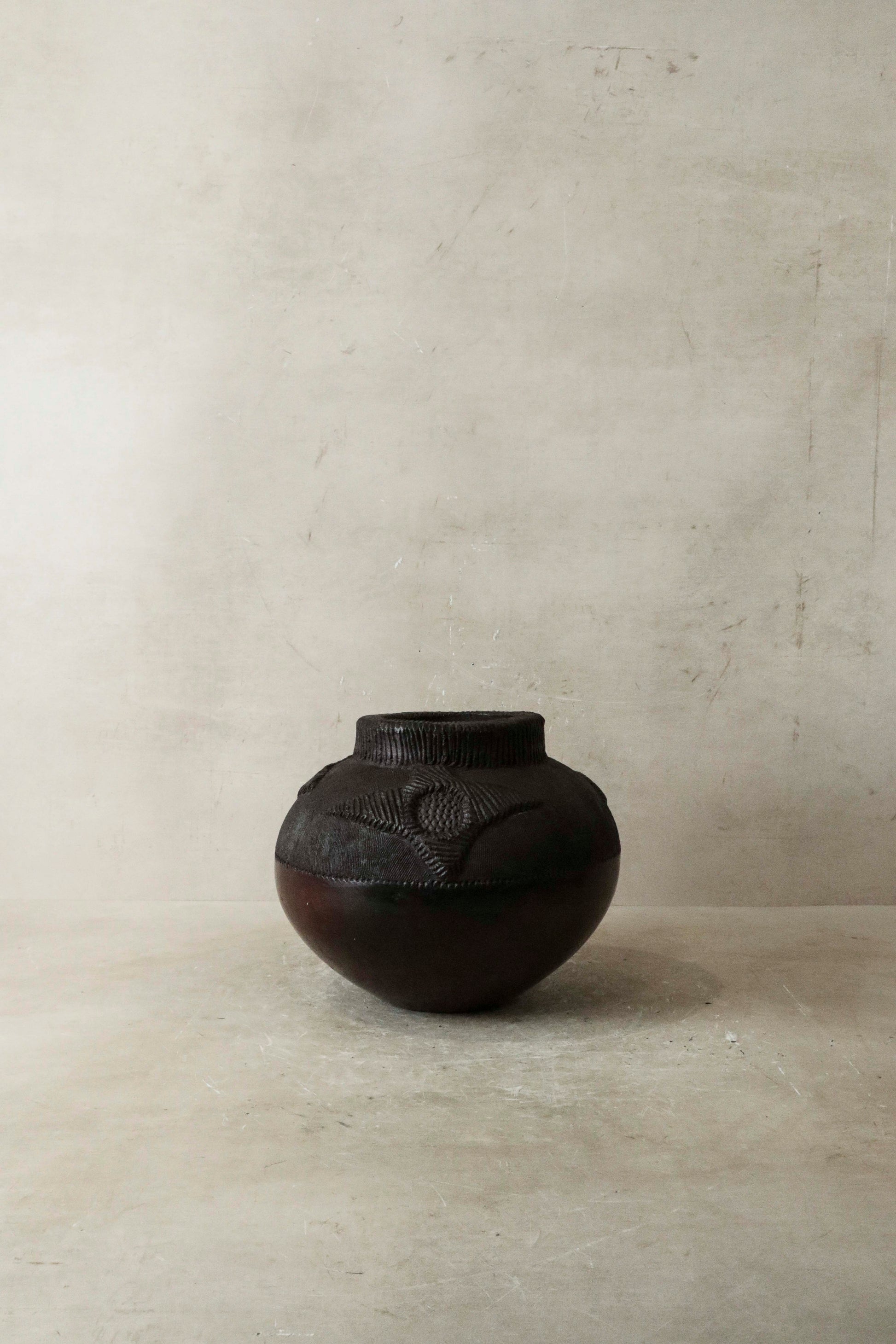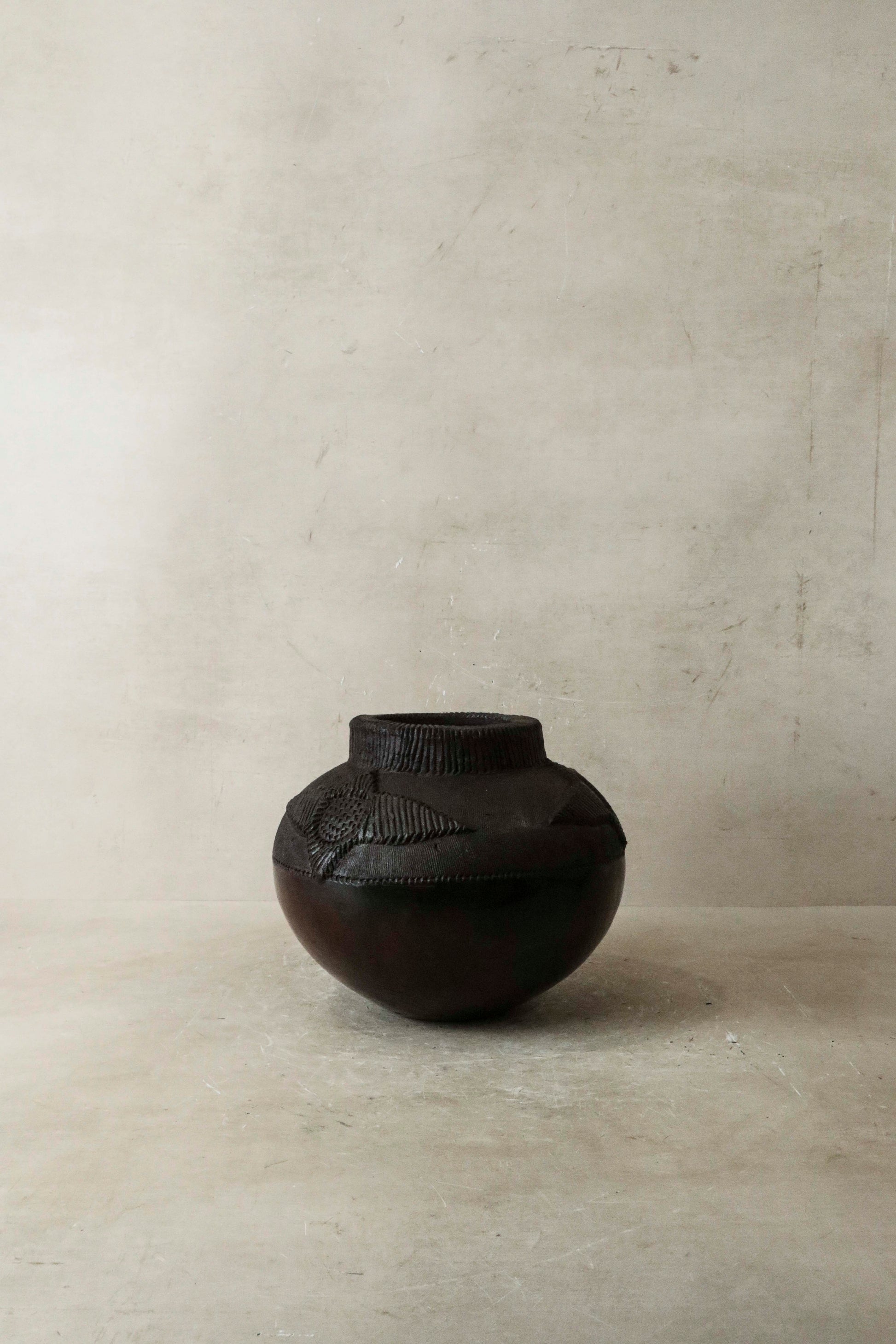 The Zulu pot, originating from South Africa, holds a distinguished role in the traditional practices of the Zulu people, primarily as vessels for the storage and consumption of beer. Crafted meticulously from clay harvested from the banks of local rivers, these pots undergo a meticulous hand-shaping process, followed by careful smoothing, culminating in firing over open-air fire pits. This time-honored technique not only imparts durability but also infuses each vessel with a distinctive character reflective of its artisan's cultural heritage, rendering every pot a unique testament to the rich tapestry of Zulu tradition.