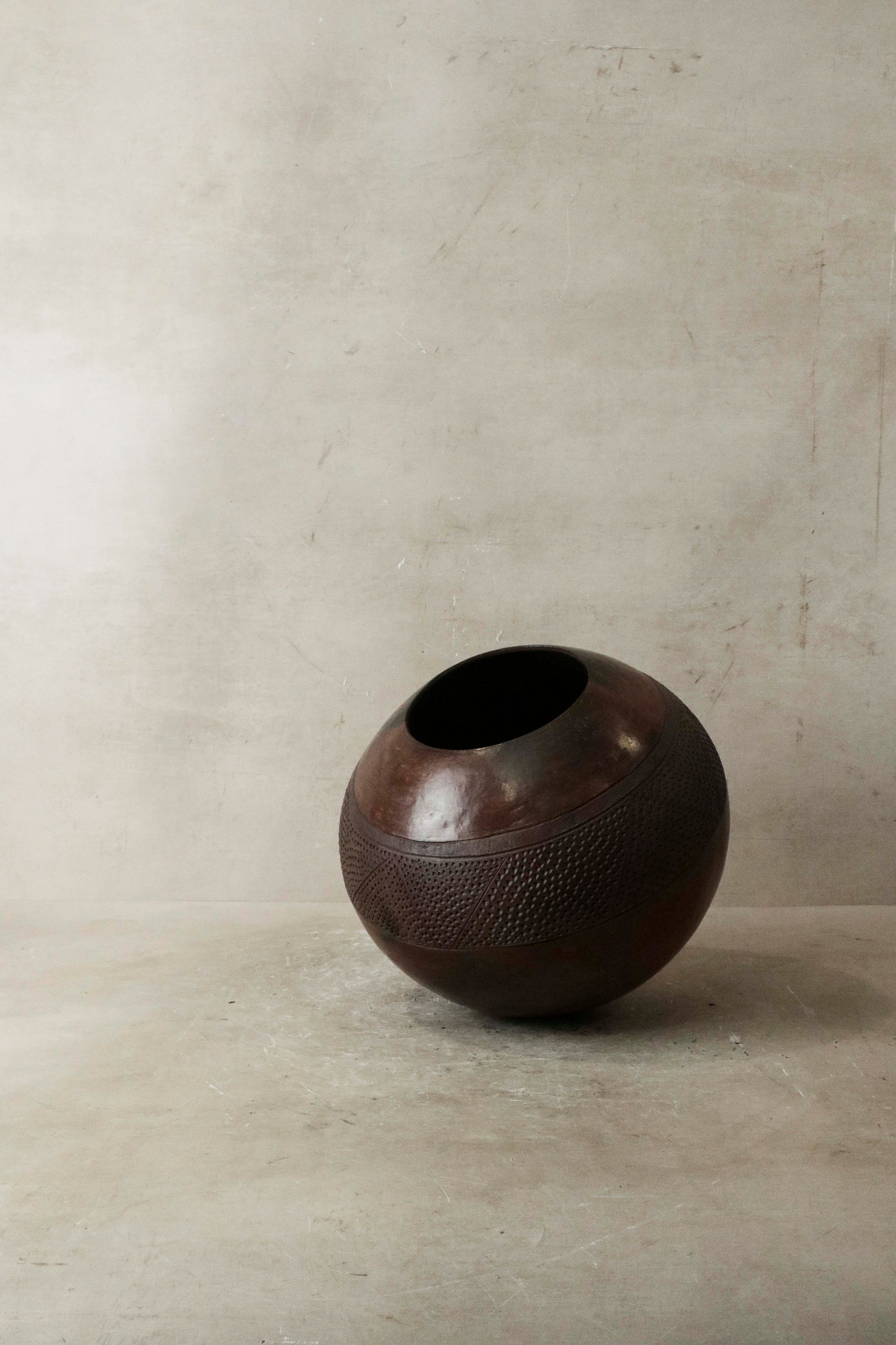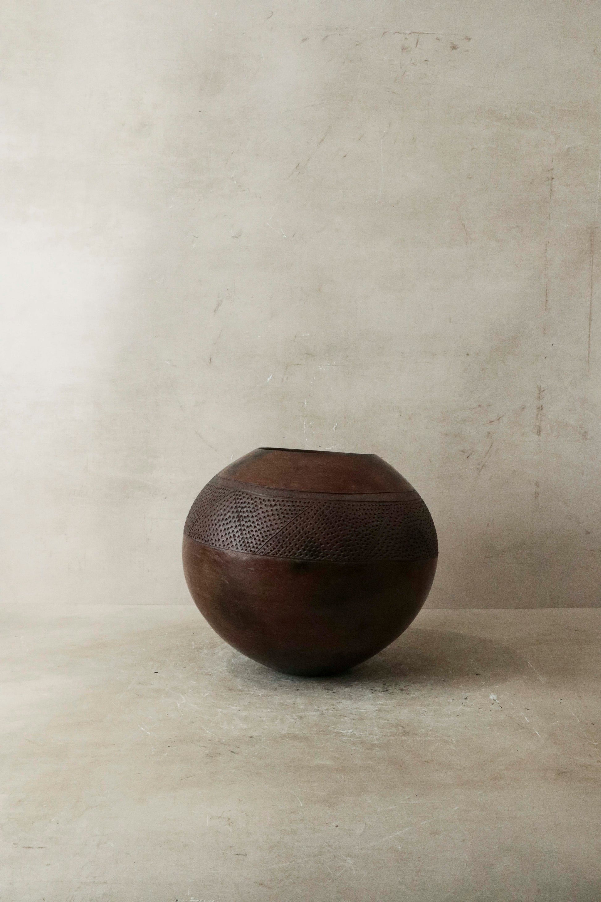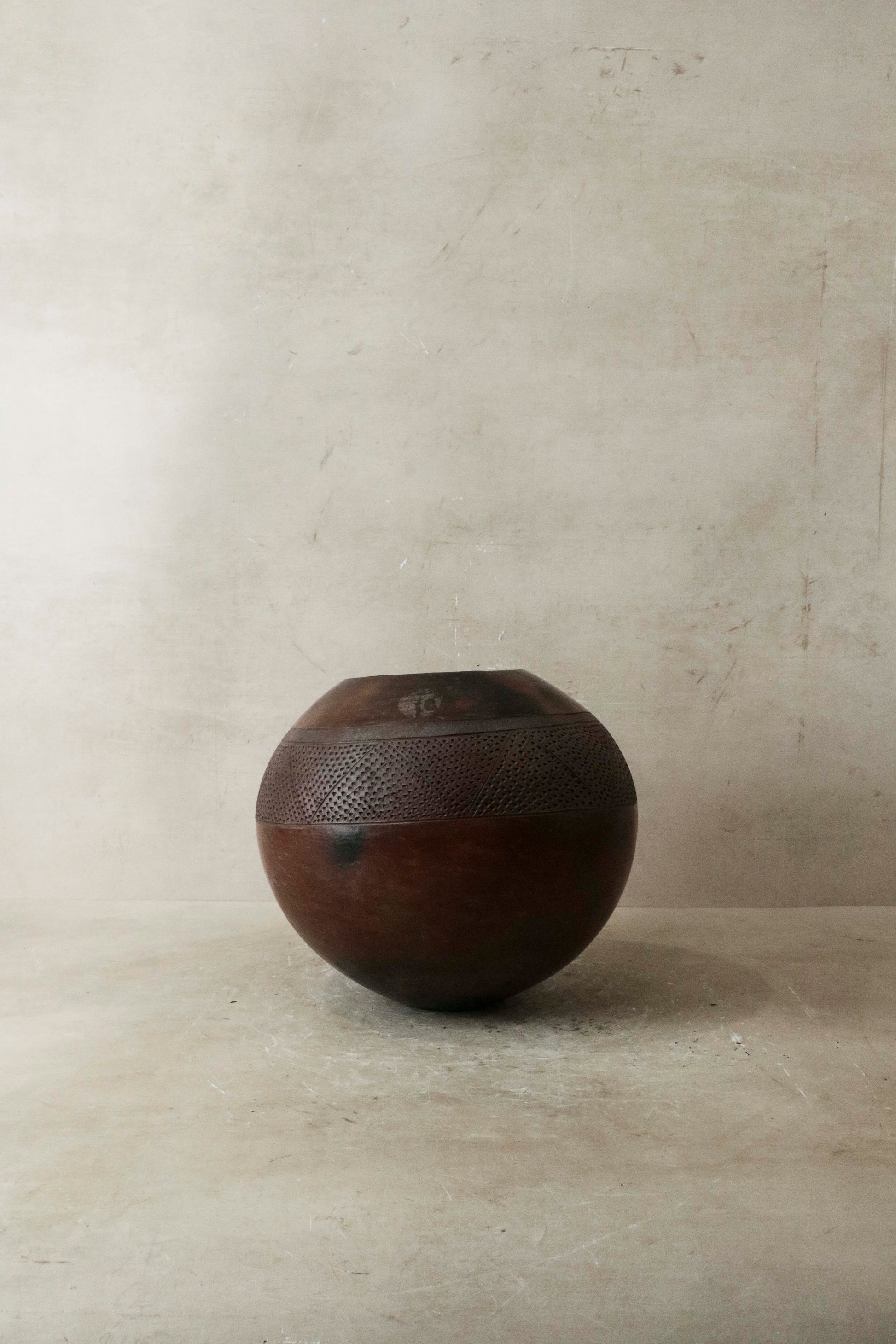 The Zulu pot, originating from South Africa, holds a distinguished role in the traditional practices of the Zulu people, primarily as vessels for the storage and consumption of beer. Crafted meticulously from clay harvested from the banks of local rivers, these pots undergo a meticulous hand-shaping process, followed by careful smoothing, culminating in firing over open-air fire pits. This time-honored technique not only imparts durability but also infuses each vessel with a distinctive character reflective of its artisan's cultural heritage, rendering every pot a unique testament to the rich tapestry of Zulu tradition.