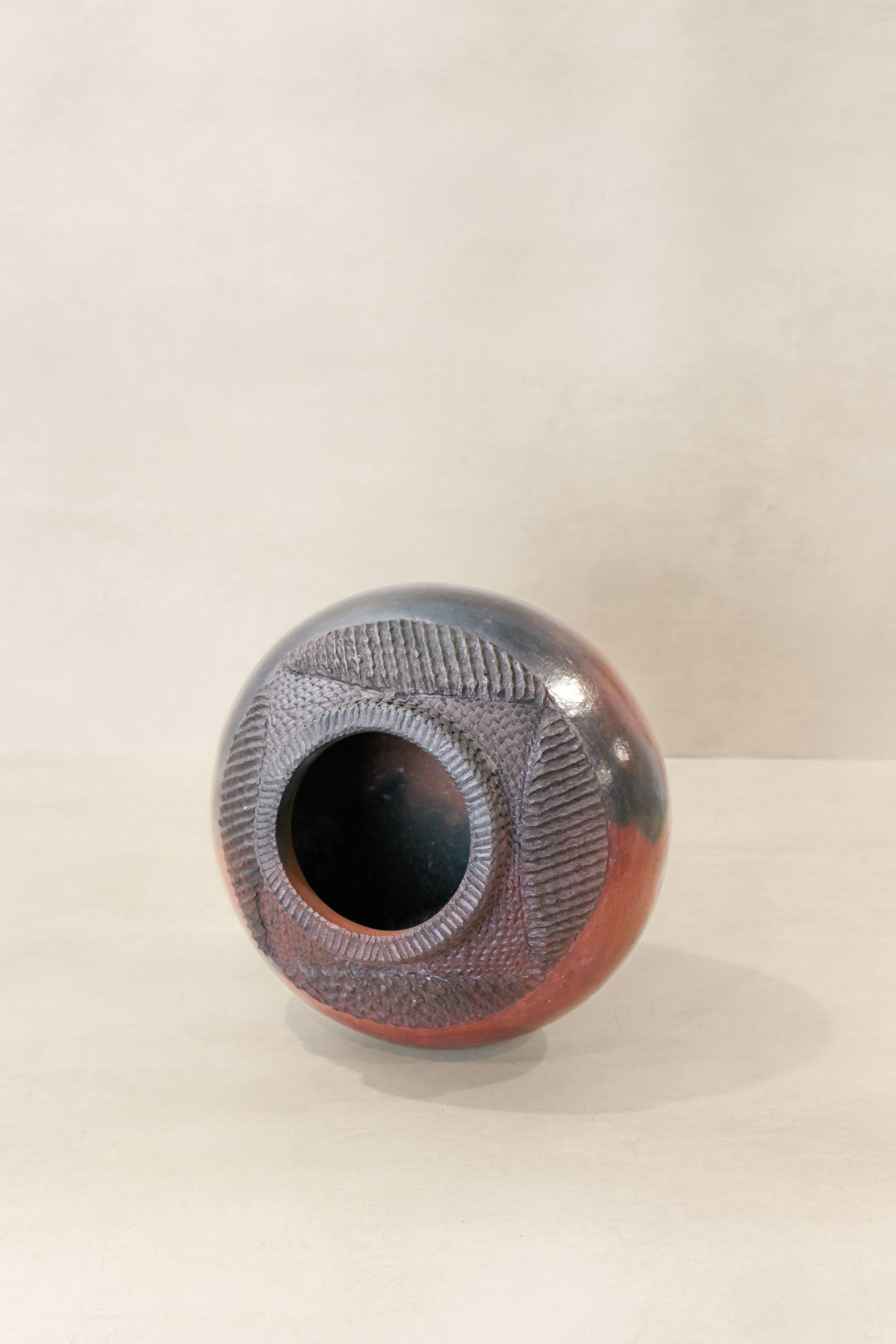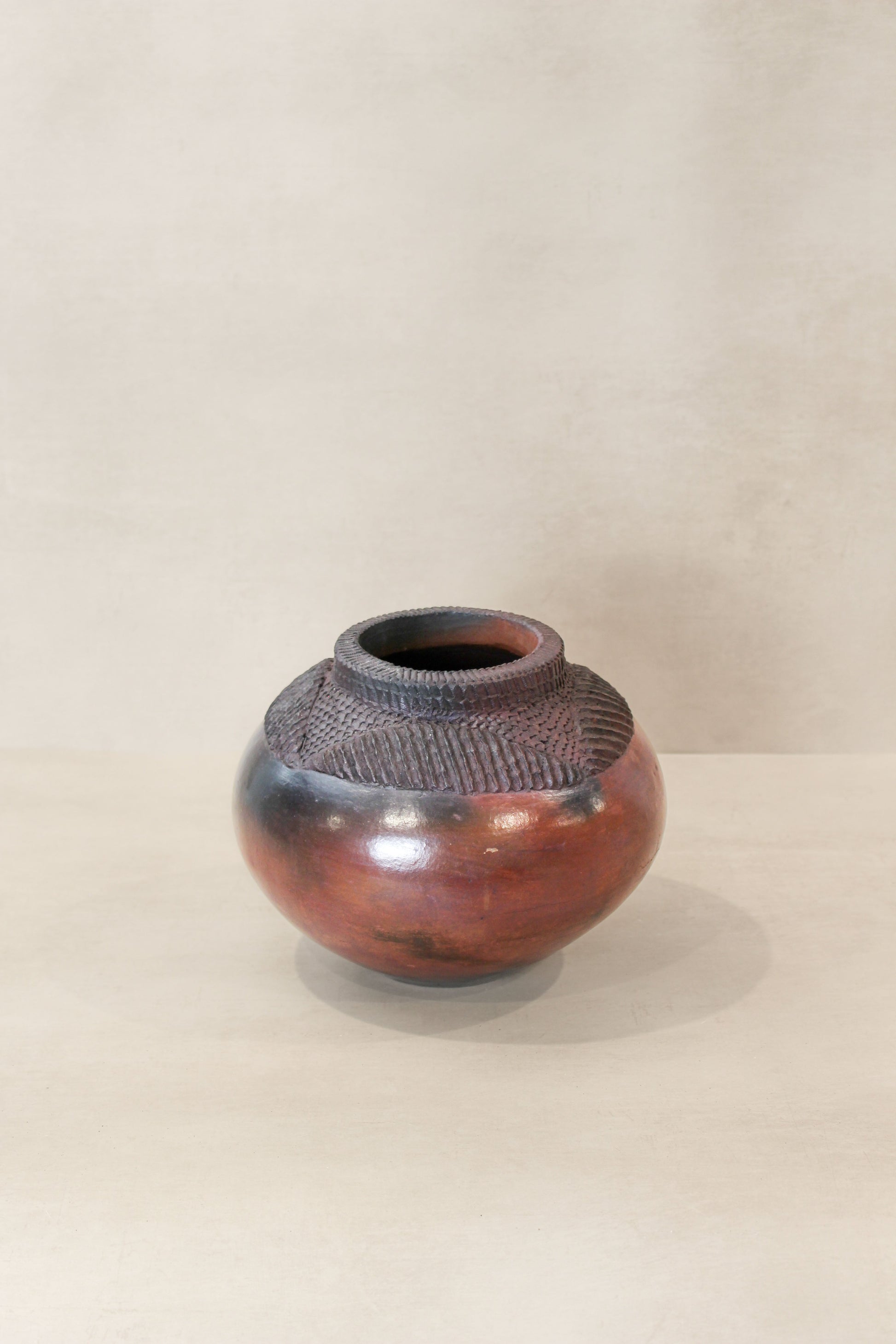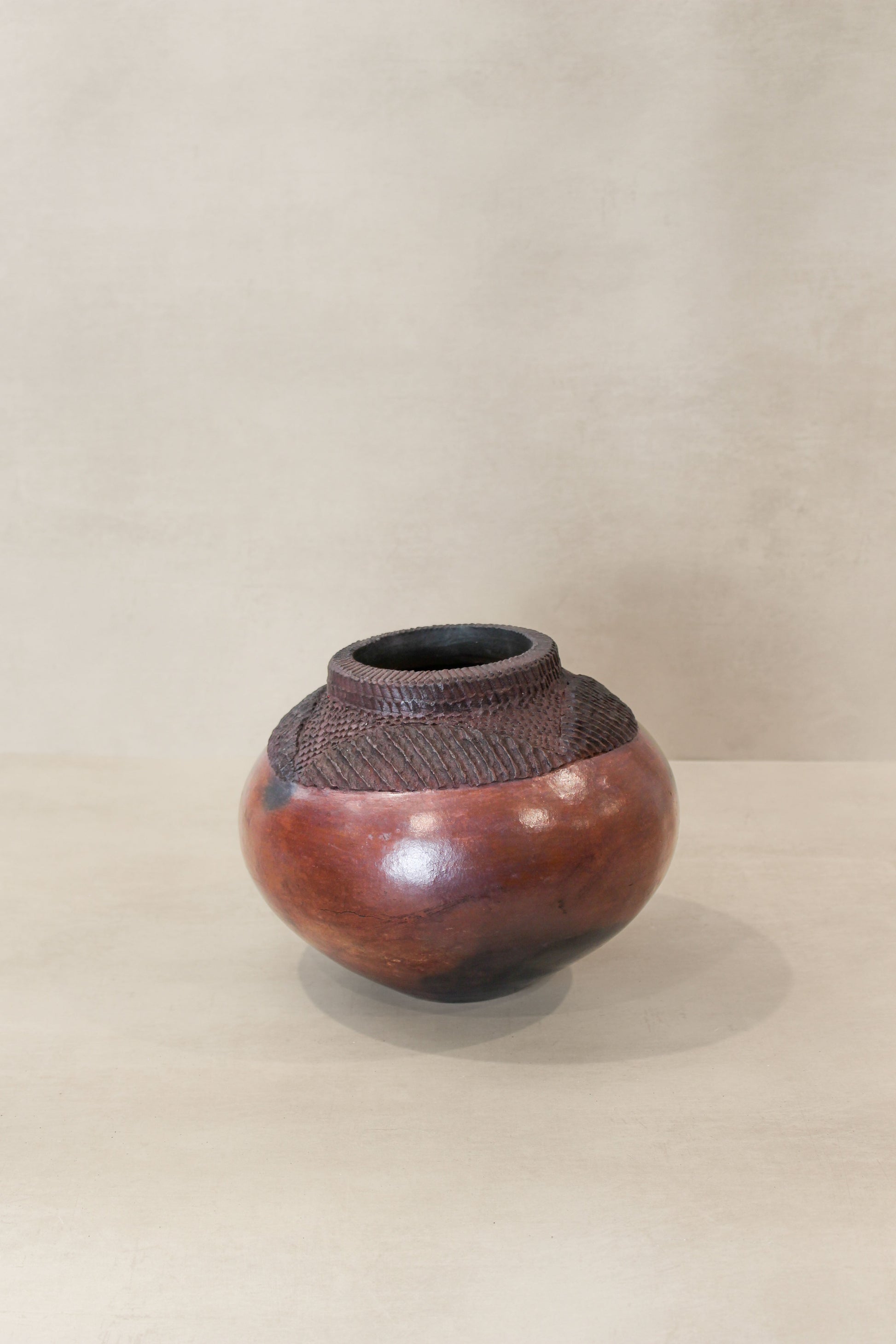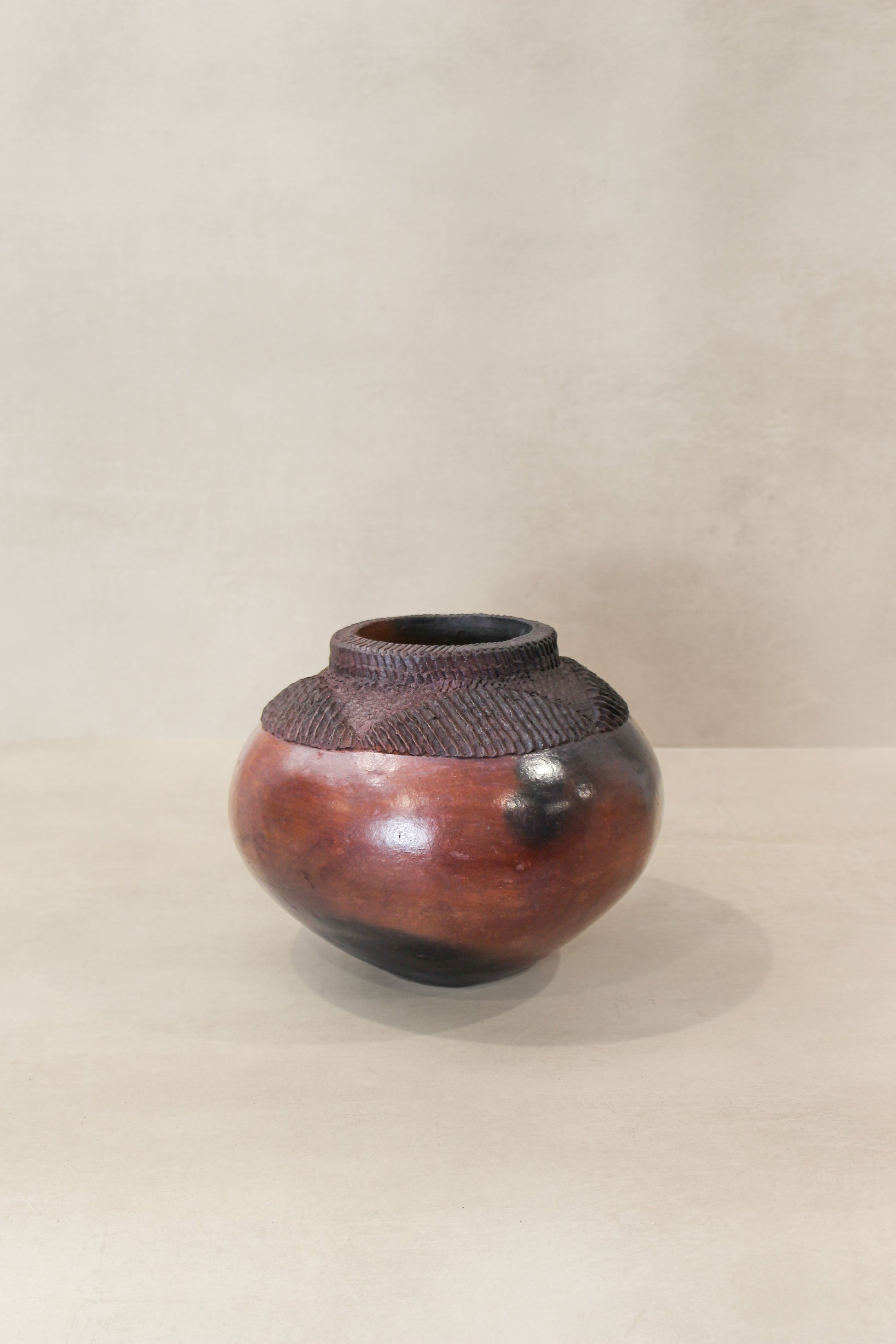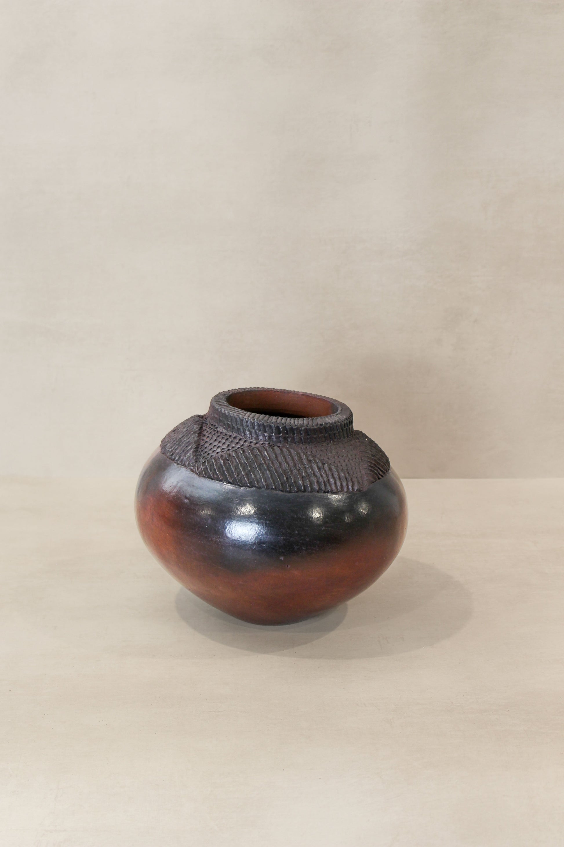 The Zulu pot, originating from South Africa, holds a distinguished role in the traditional practices of the Zulu people, primarily as vessels for the storage and consumption of beer. Crafted meticulously from clay harvested from the banks of local rivers, these pots undergo a meticulous hand-shaping process, followed by careful smoothing, culminating in firing over open-air fire pits. This time-honored technique not only imparts durability but also infuses each vessel with a distinctive character reflective of its artisan's cultural heritage, rendering every pot a unique testament to the rich tapestry of Zulu tradition.