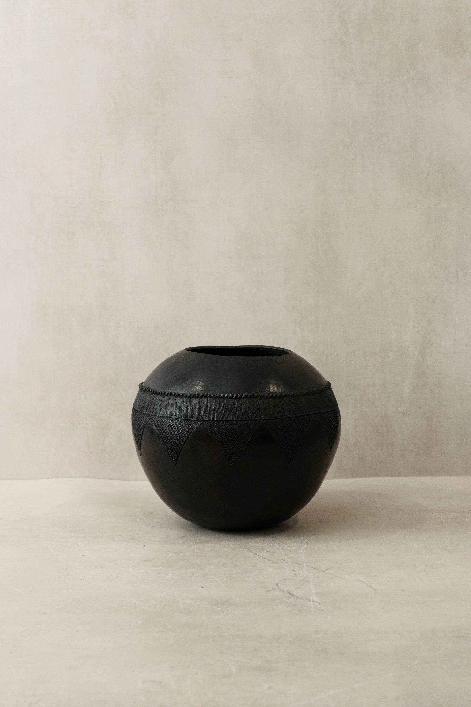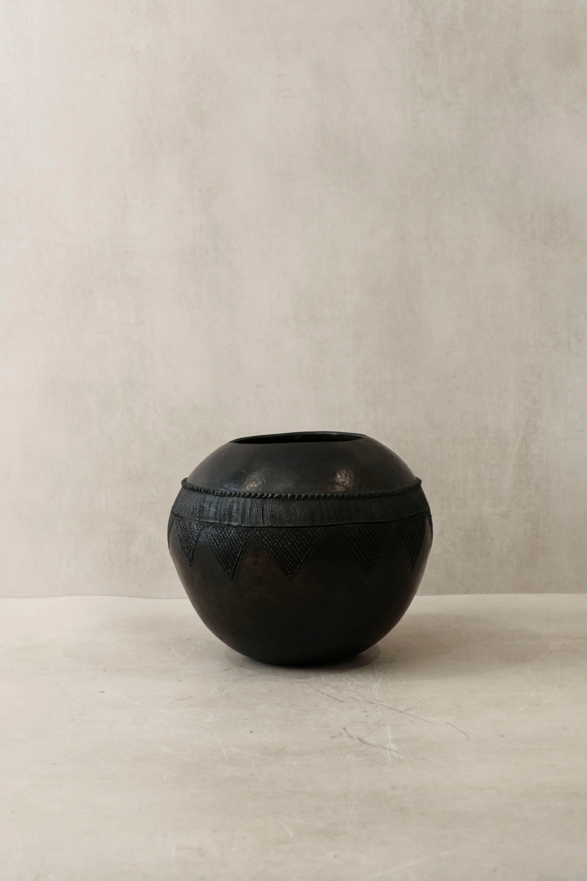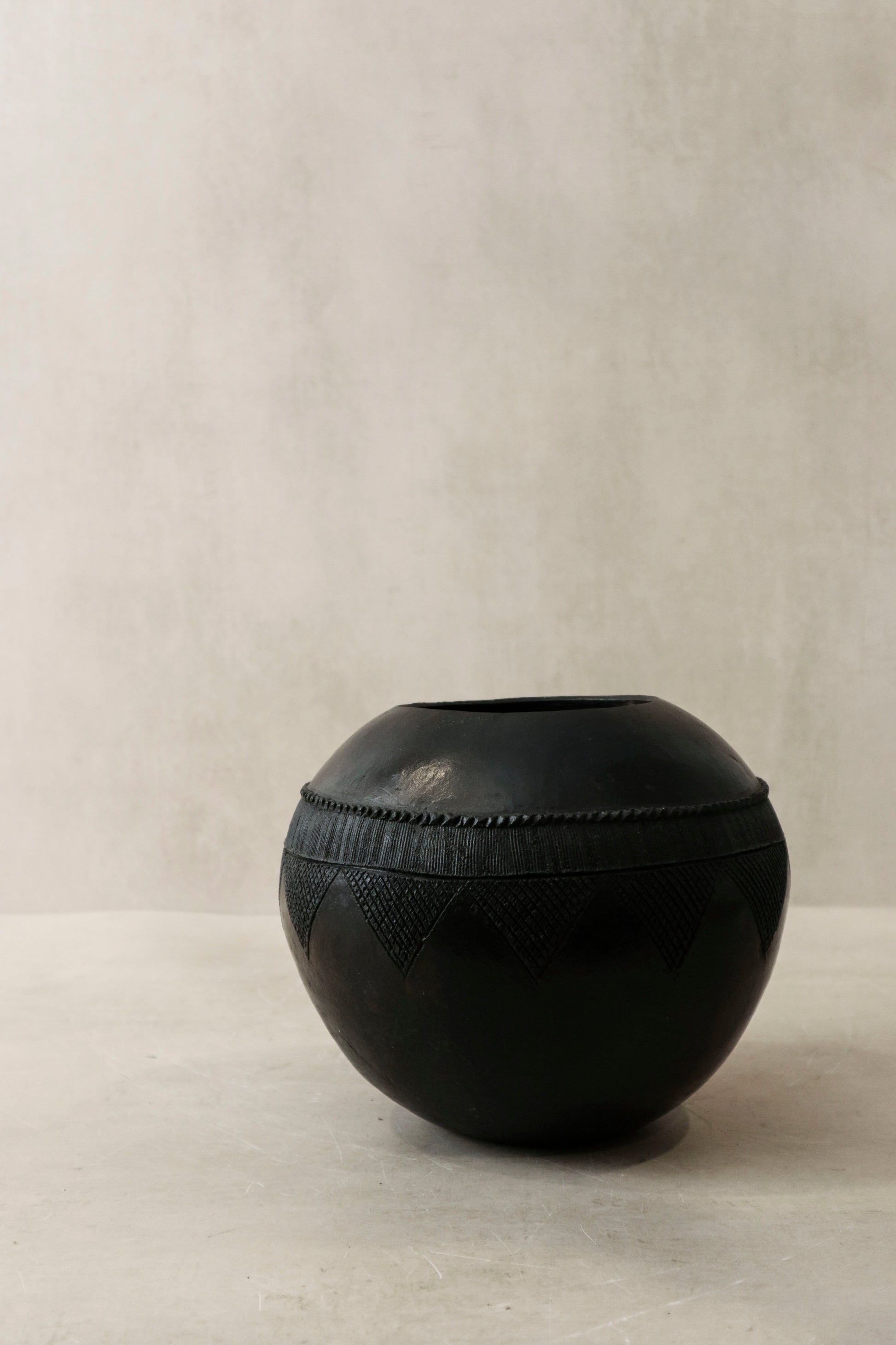 The Zulu pot, originating from South Africa, holds a distinguished role in the traditional practices of the Zulu people, primarily as vessels for the storage and consumption of beer. Crafted meticulously from clay harvested from the banks of local rivers, these pots undergo a meticulous hand-shaping process, followed by careful smoothing, culminating in firing over open-air fire pits. This time-honored technique not only imparts durability but also infuses each vessel with a distinctive character reflective of its artisan's cultural heritage, rendering every pot a unique testament to the rich tapestry of Zulu tradition.