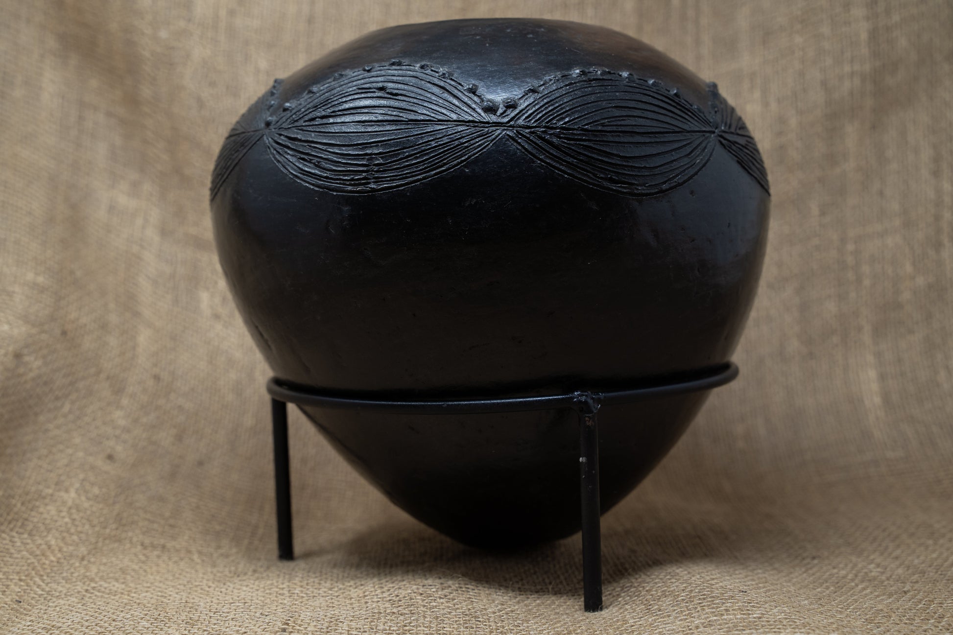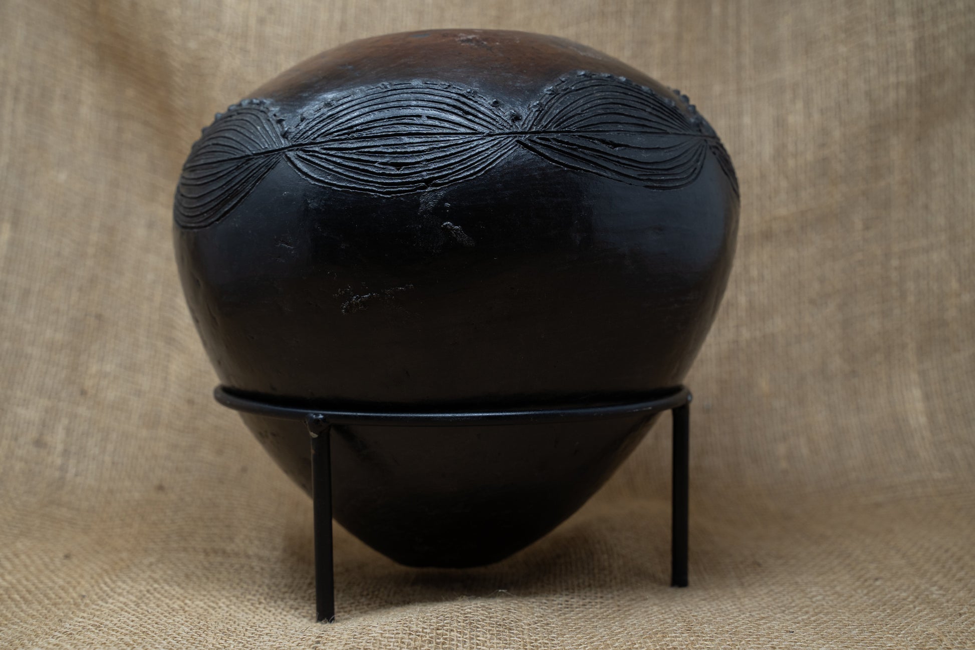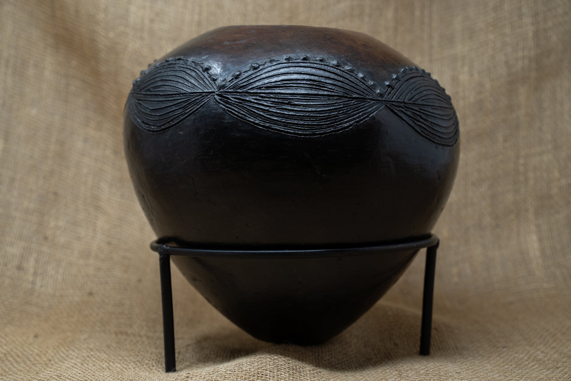 The Zulu pot, originating from South Africa, holds a distinguished role in the traditional practices of the Zulu people, primarily as vessels for the storage and consumption of beer. Crafted meticulously from clay harvested from the banks of local rivers, these pots undergo a meticulous hand-shaping process, followed by careful smoothing, culminating in firing over open-air fire pits. This time-honored technique not only imparts durability but also infuses each vessel with a distinctive character reflective of its artisan's cultural heritage, rendering every pot a unique testament to the rich tapestry of Zulu tradition.
